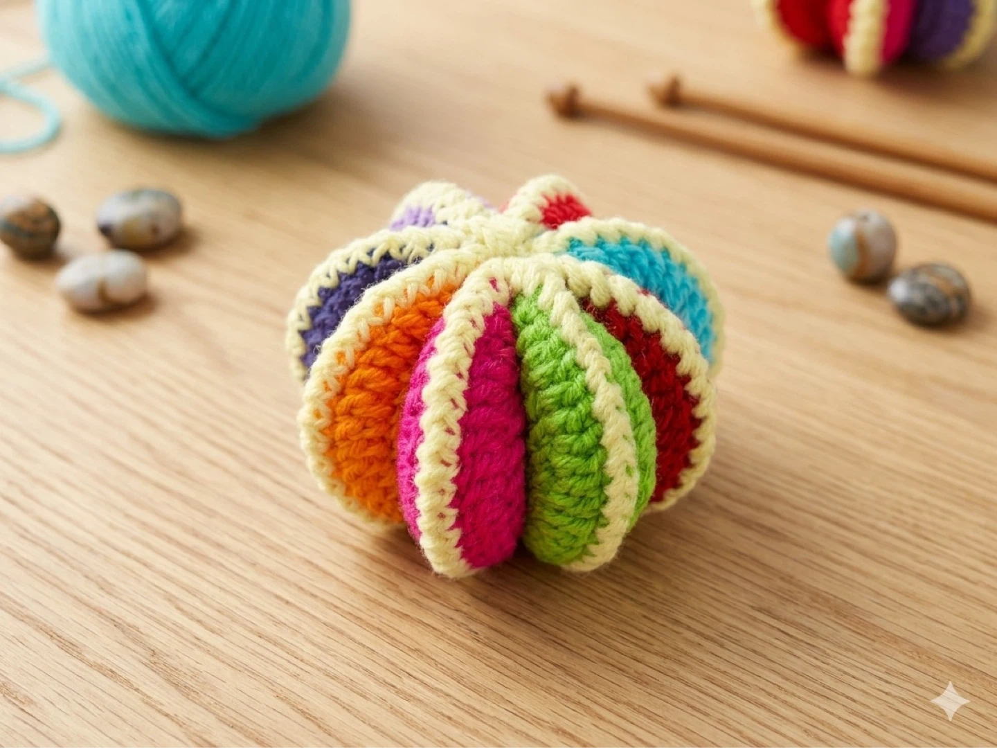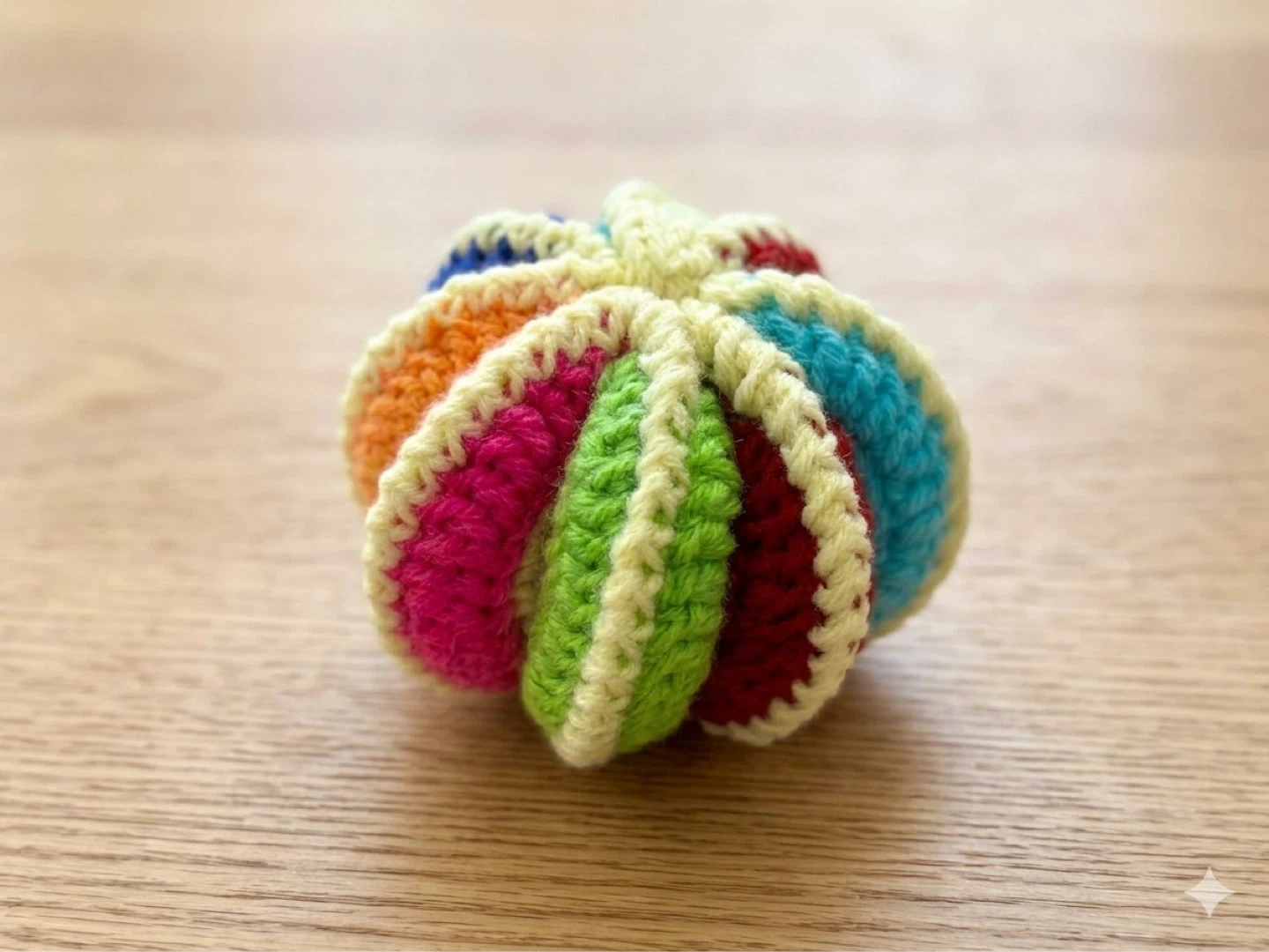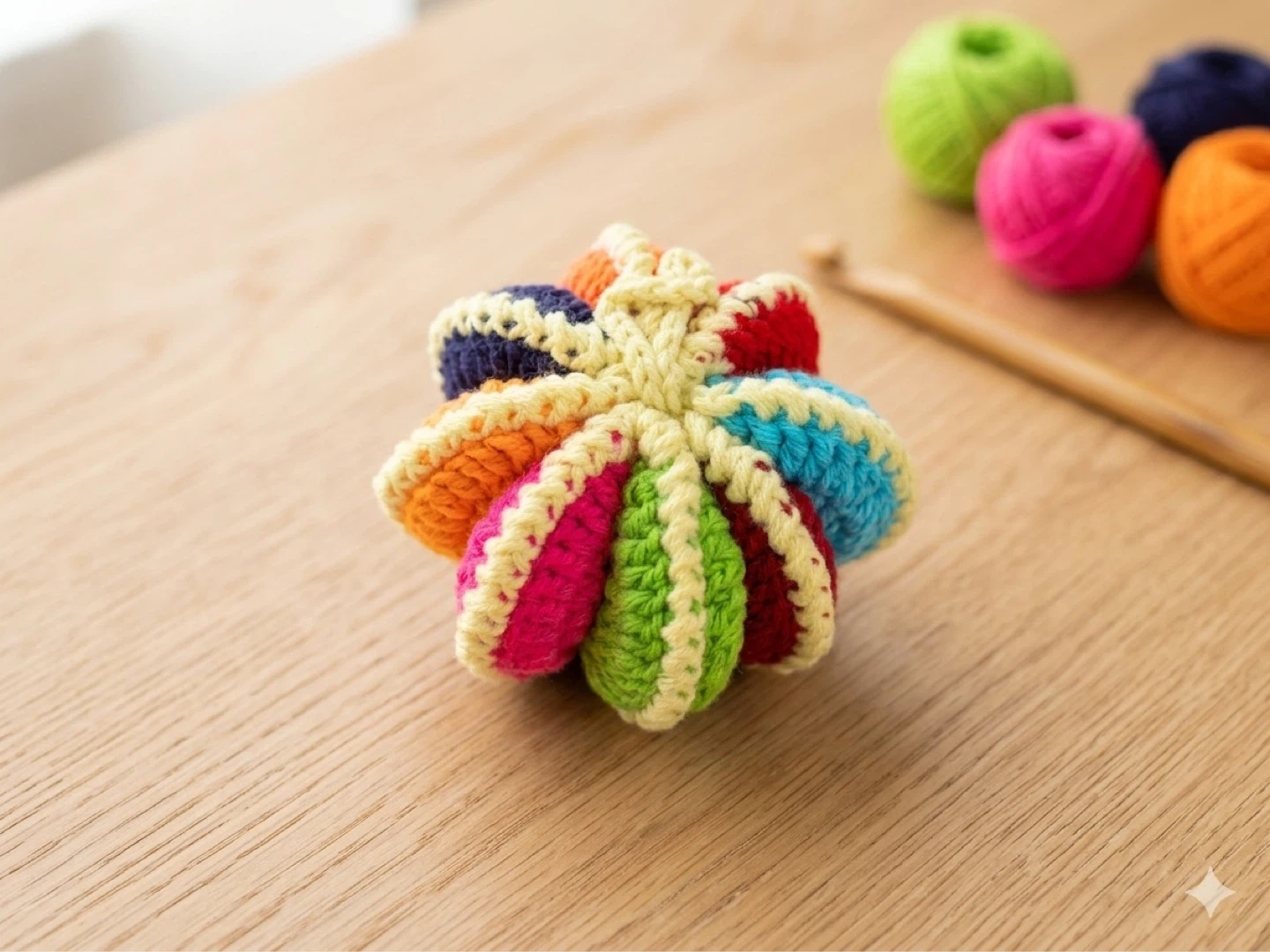 This is a colourful handmade crochet rattle ball. It's made with soft yarn and has a small rattle inside. Perfect for little hands to grasp and explore!