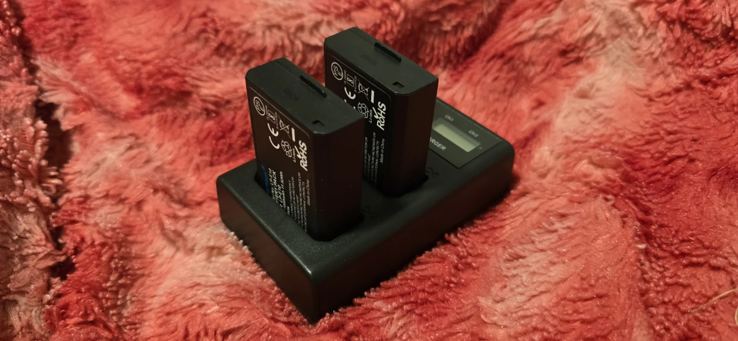 Canon EOS Rebel T7 DSLR camera. Includes two batteries and a charging base. Best camera for beginners.