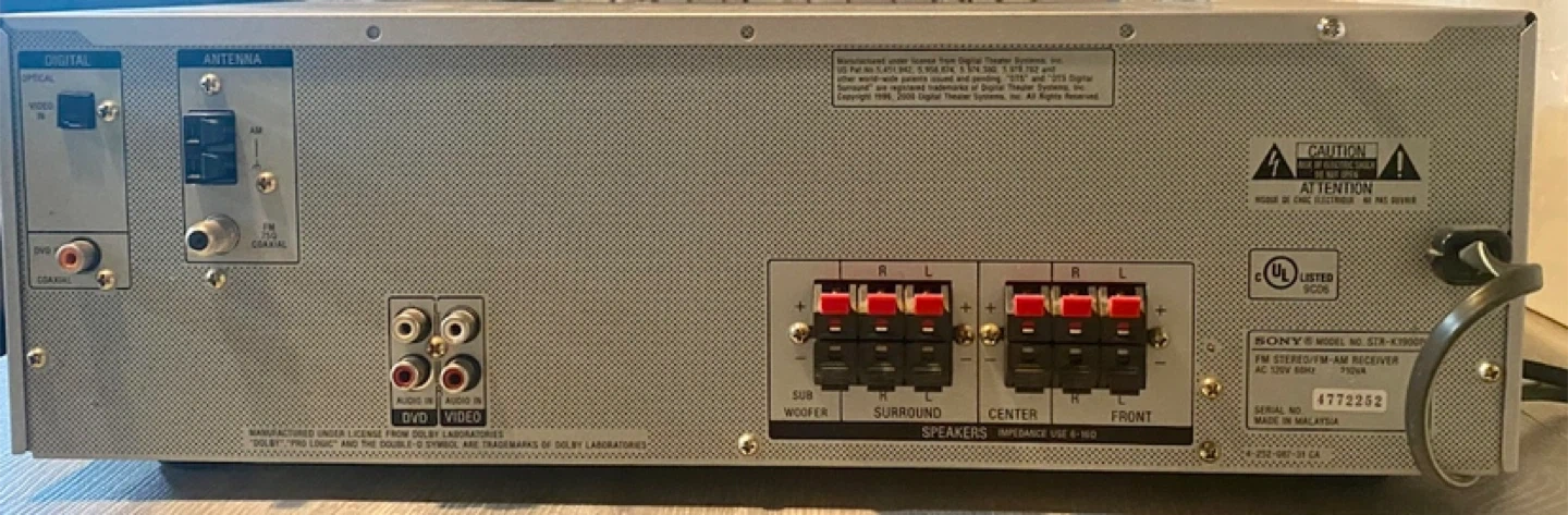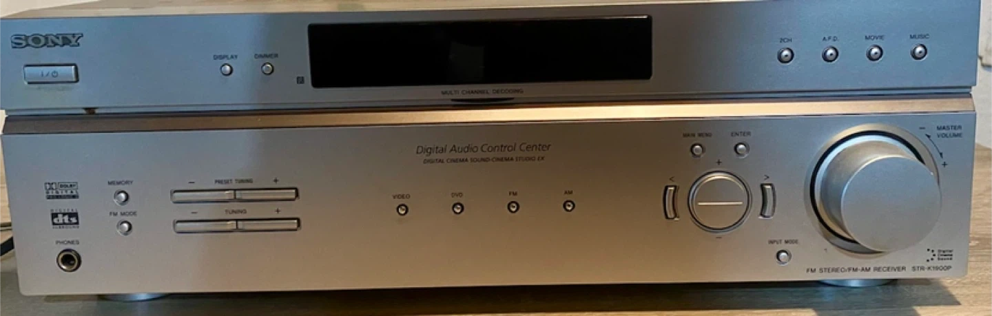 Sony AV Receiver, model STR-K1000P. This receiver features digital audio control with multiple inputs including optical, coaxial, DVD, FM, and AM. It supports surround sound and includes A/V outputs.