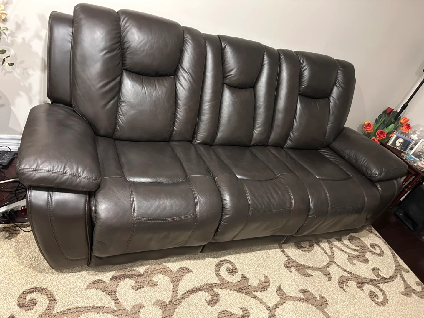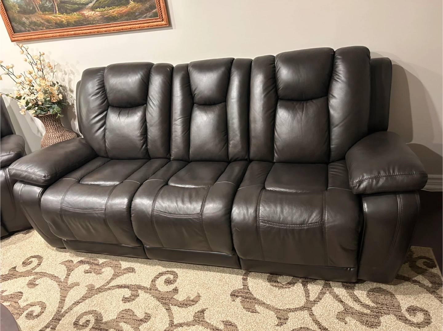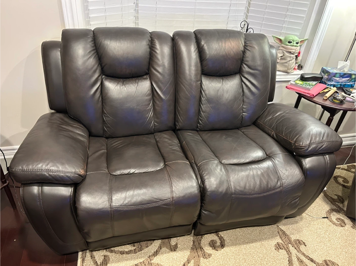 Selling a comfy brown leather reclining sofa and loveseat set! They're in good condition and perfect for a living room or entertainment space. The reclining feature works great, making them ideal for relaxing after a long day. Only the two seater is a bit worn but still have a lot of life left in it!