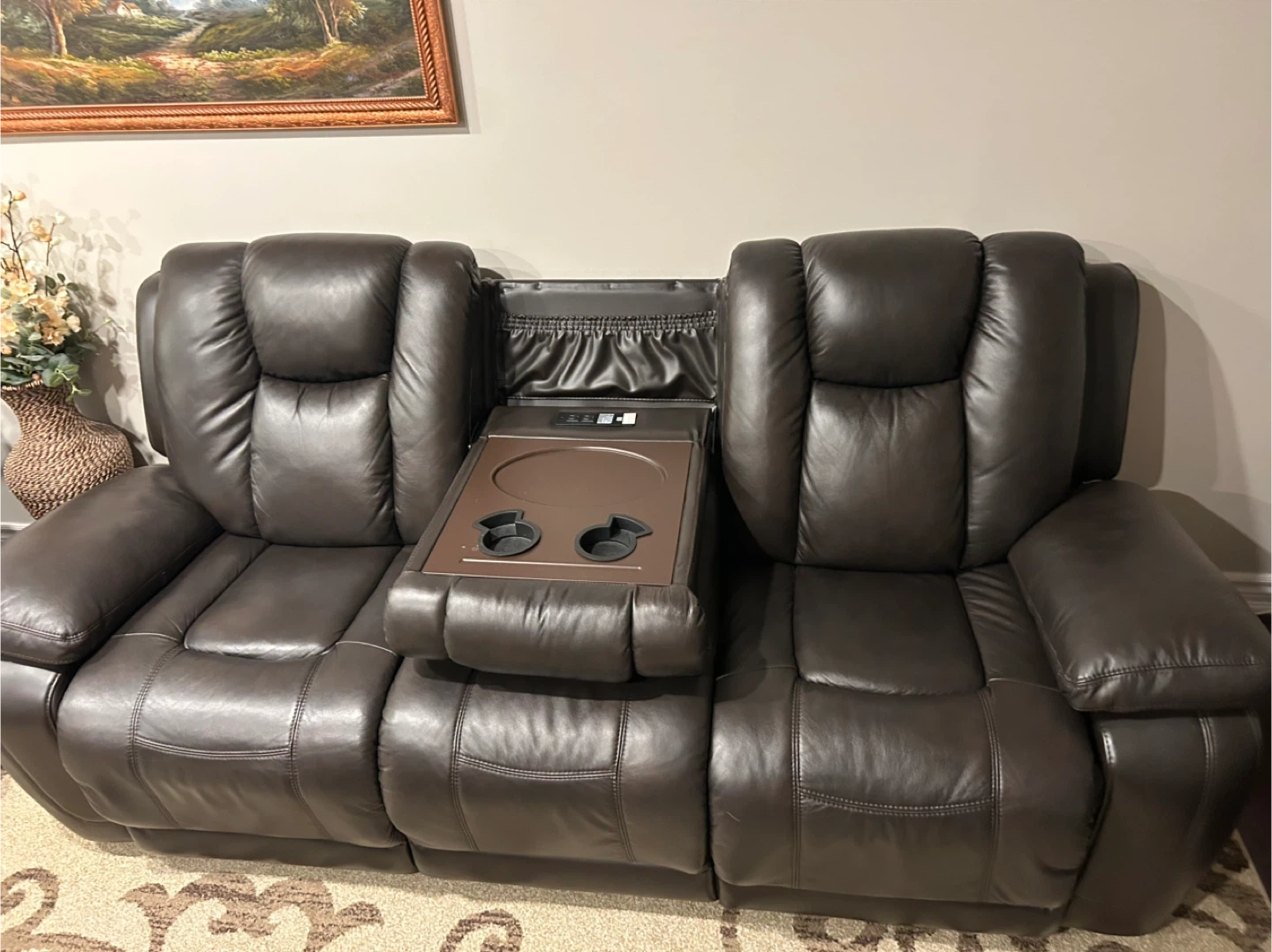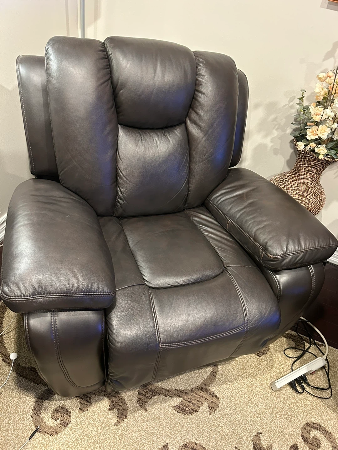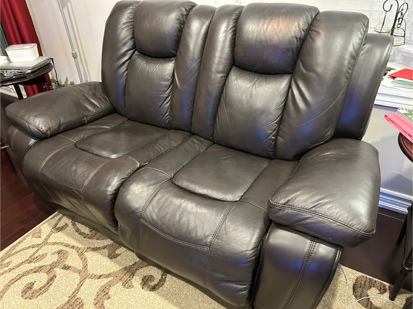 Selling a comfy brown leather reclining sofa and loveseat set! They're in good condition and perfect for a living room or entertainment space. The reclining feature works great, making them ideal for relaxing after a long day. Only the two seater is a bit worn but still have a lot of life left in it!