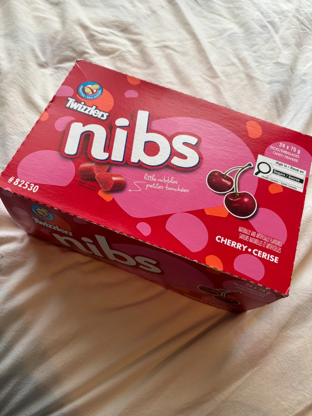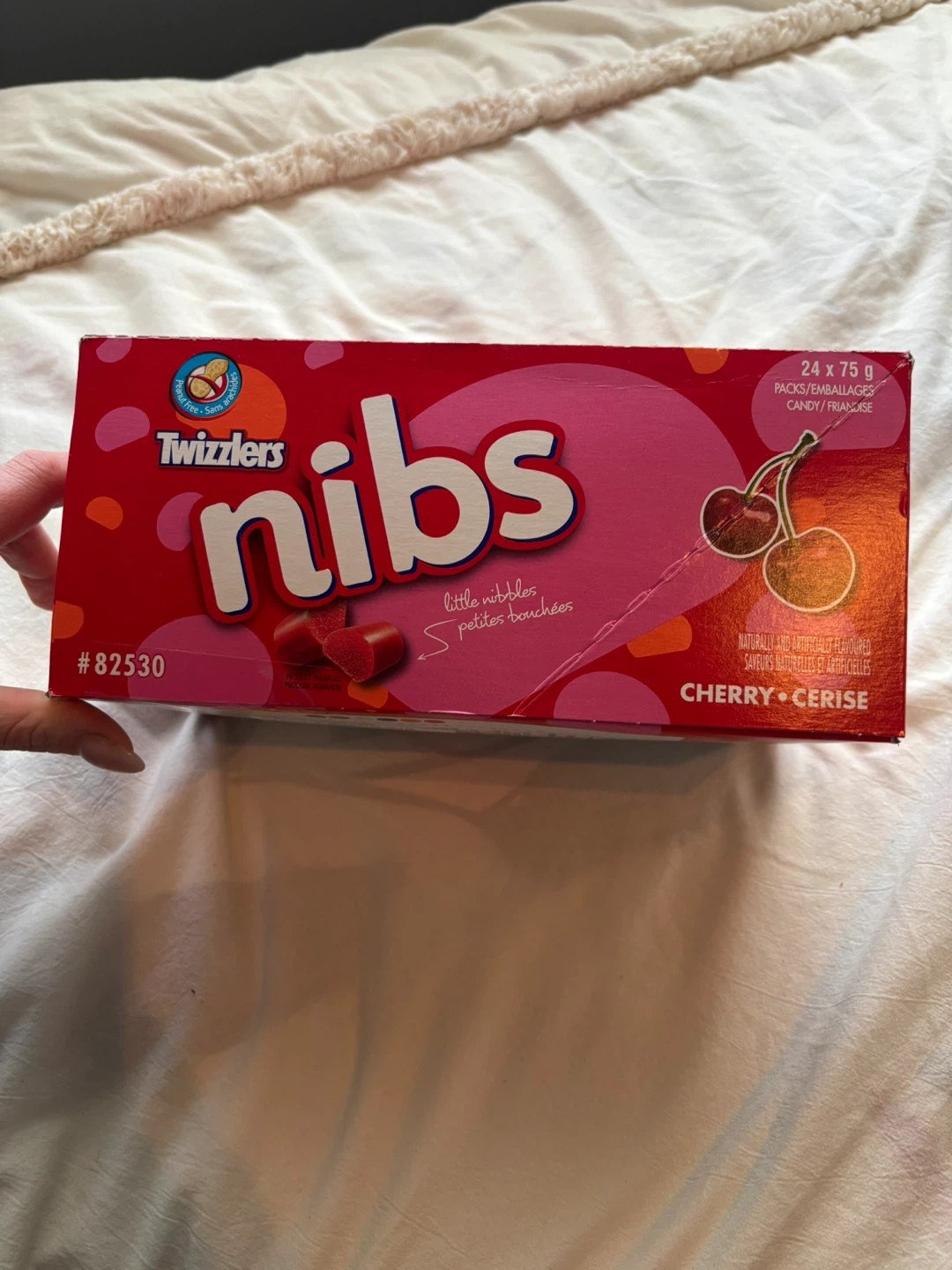 Selling a box of Twizzlers Nibs in cherry flavour! It contains 24 packs of 75g each. Perfect for little nibbles!