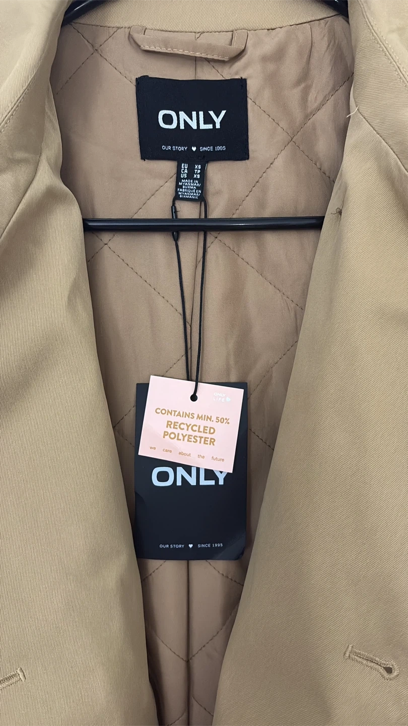 This is a tan short trench coat from ONLY. It's made with a minimum of 50% recycled polyester. Features a quilted lining and a classic double-breasted button closure.