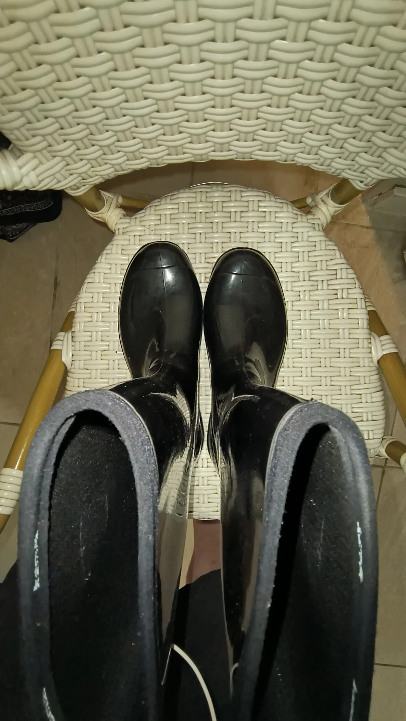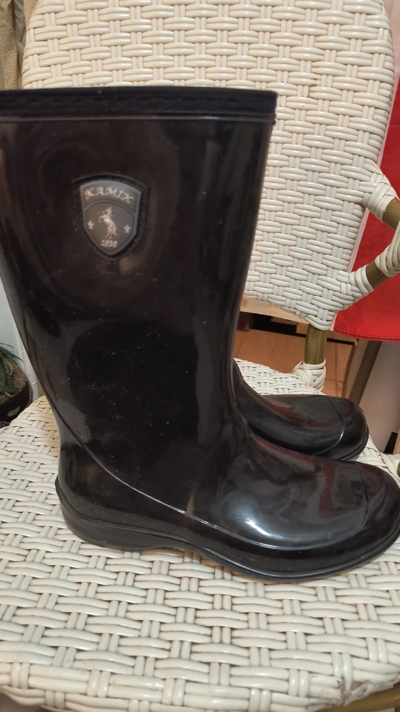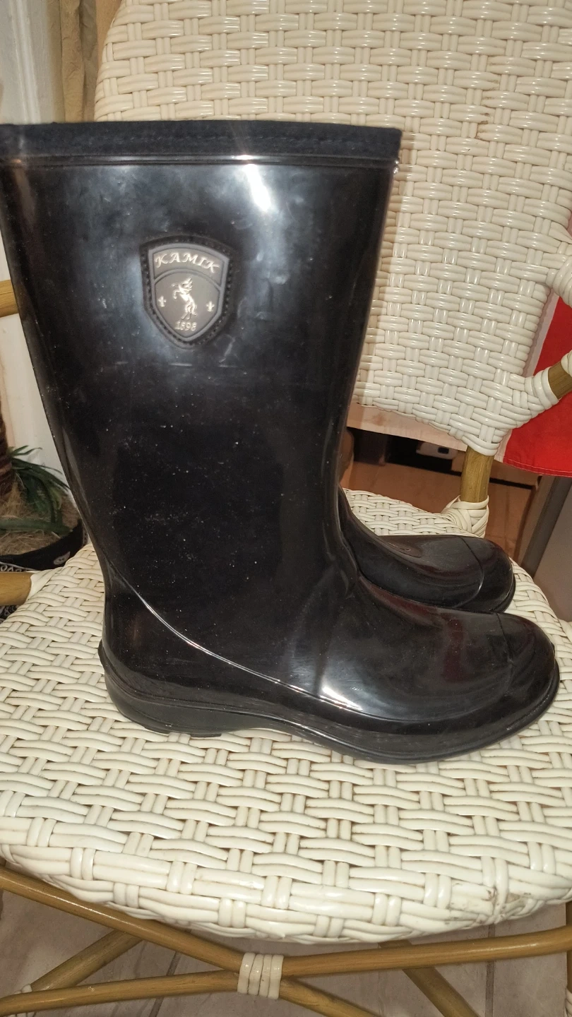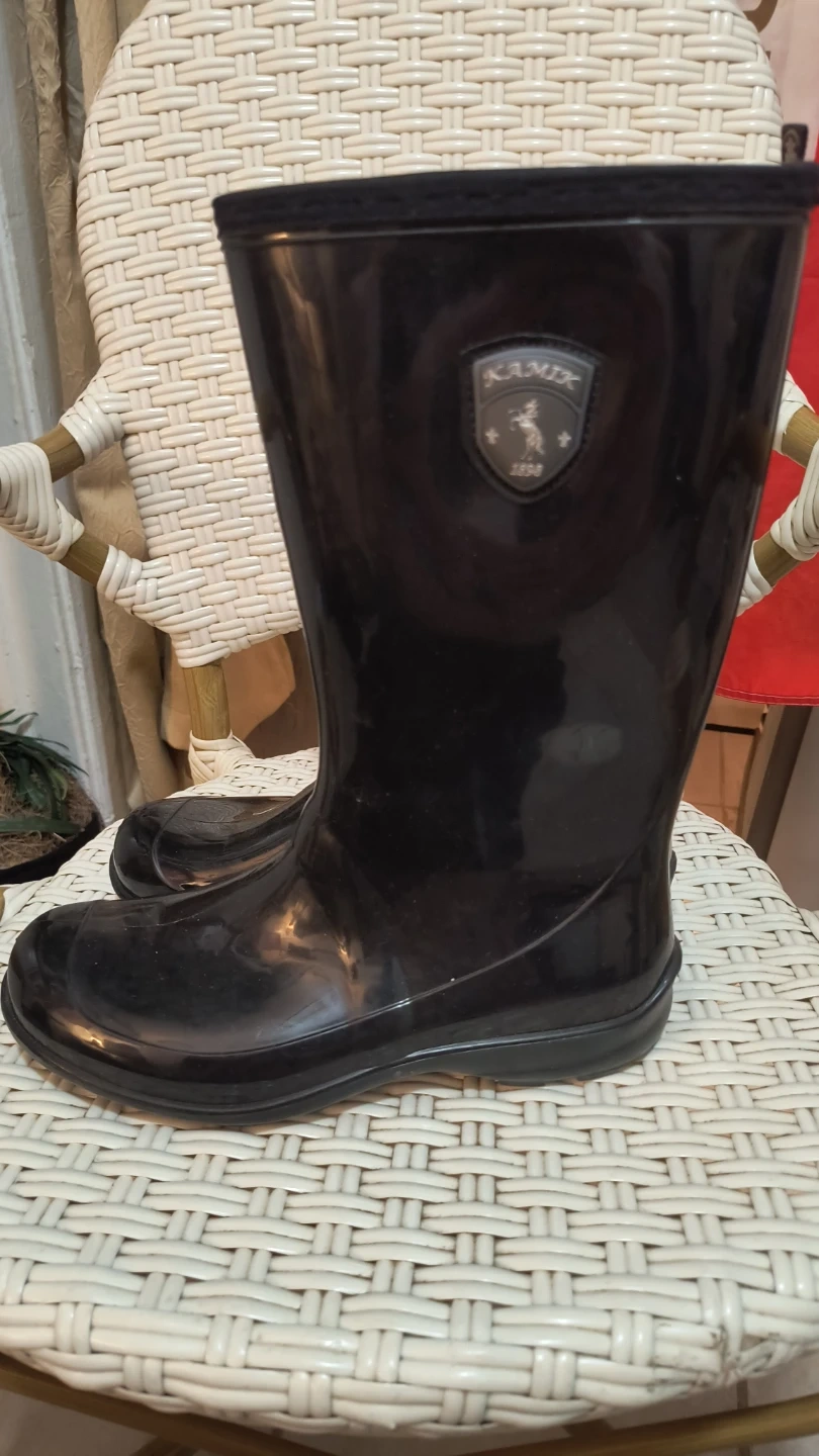 These Kamik rain boots are black and made of rubber. They're fully waterproof and feature a durable construction. Perfect for keeping your feet dry in wet weather!