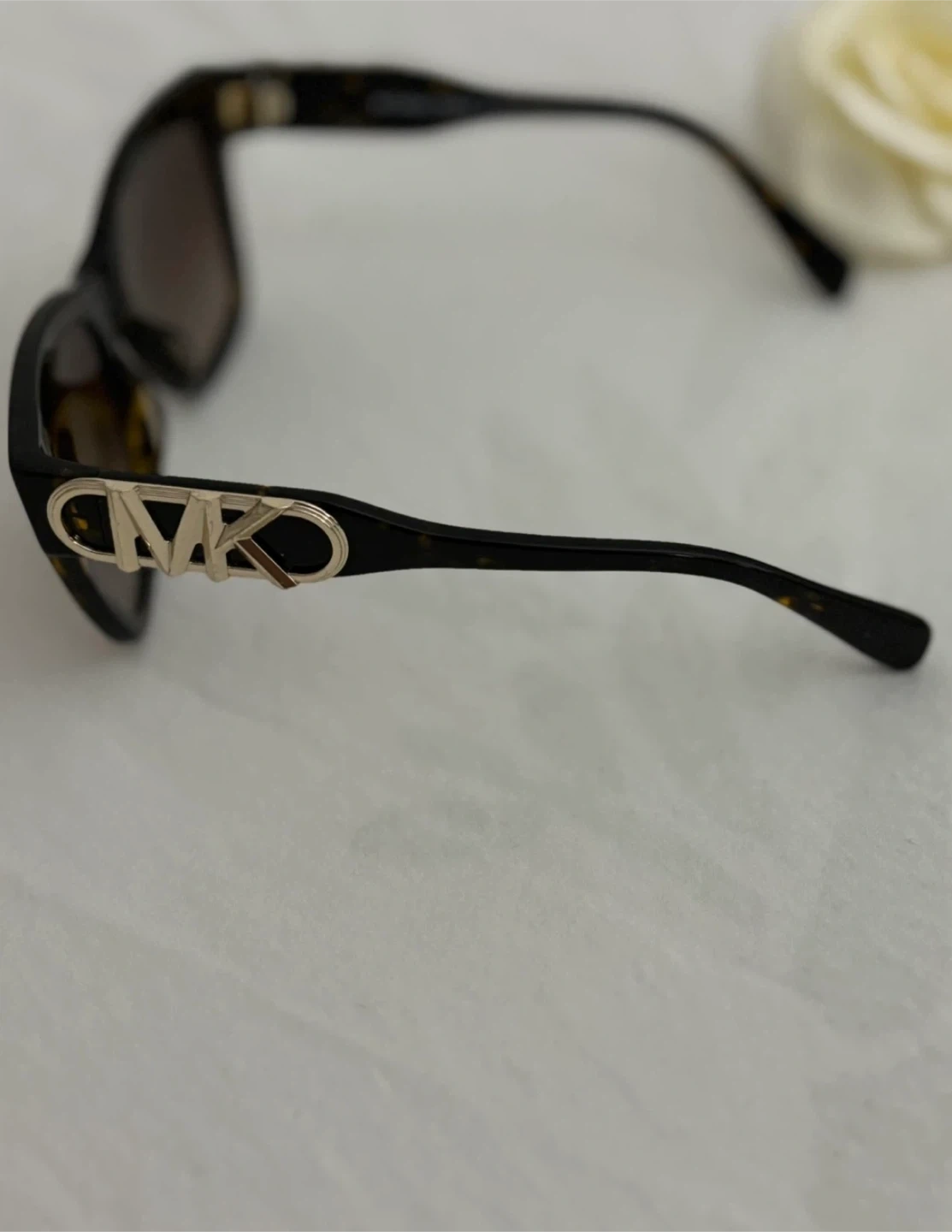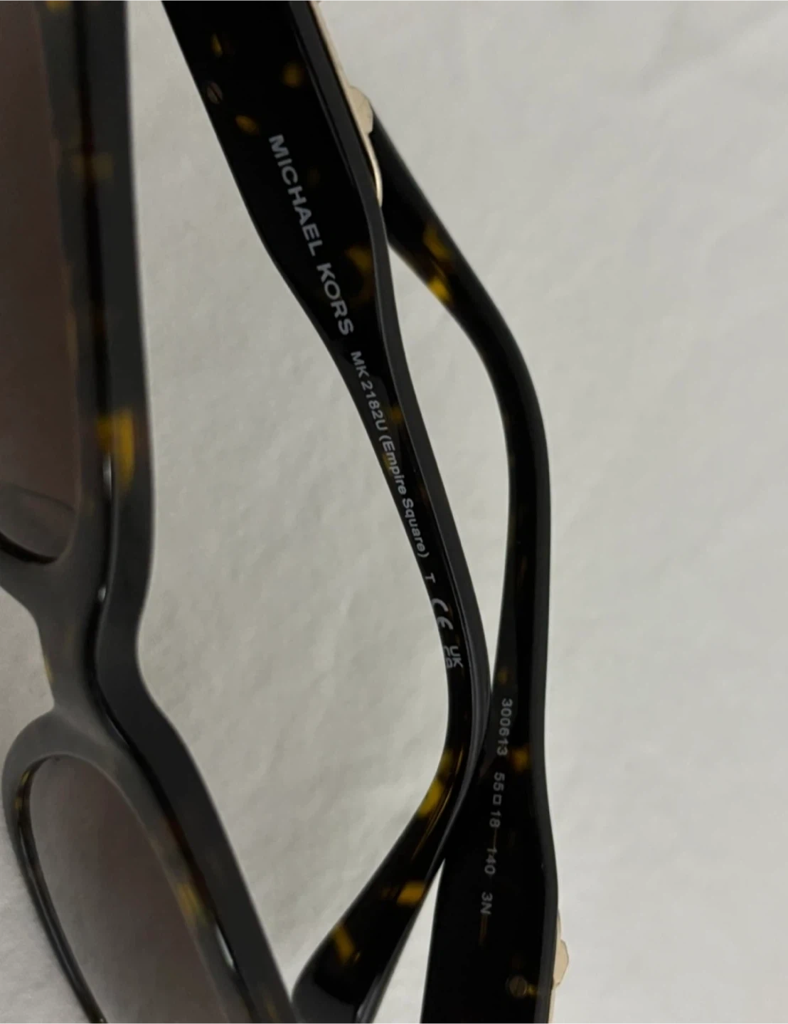 Michael Kors MK2162U "Empire Square" sunglasses in a tortoiseshell pattern with gold MK logos on the sides. The lenses are brown gradient. Lens width 55mm, bridge 18mm, temple length 140mm.