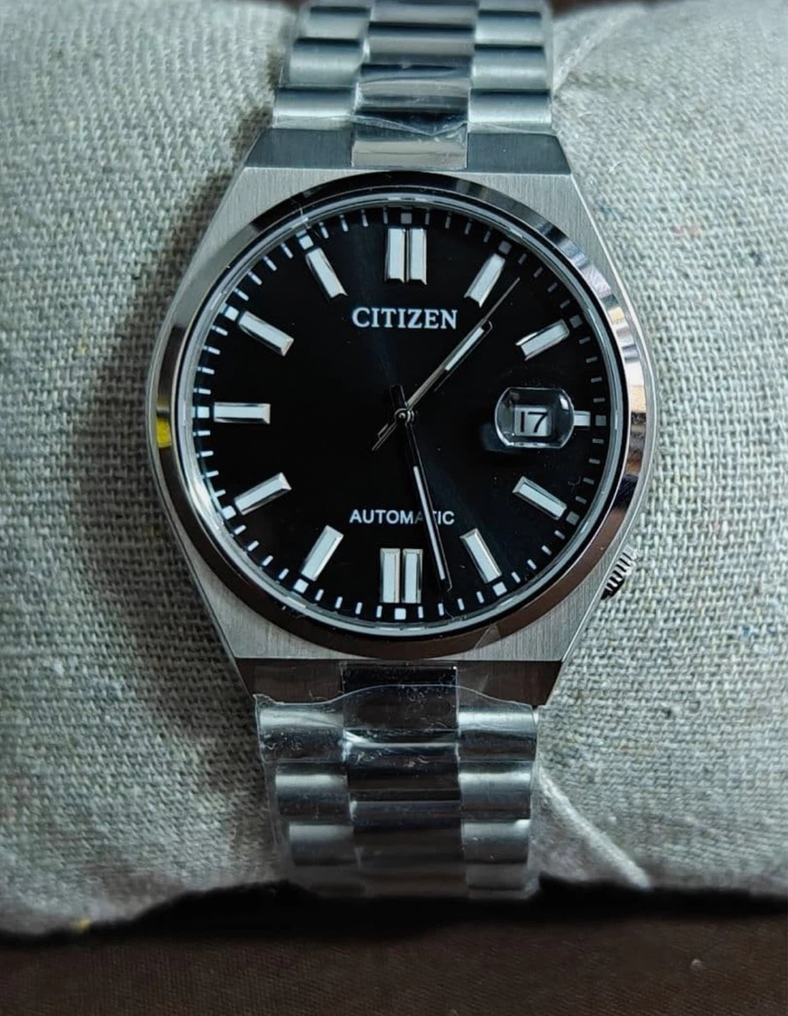 Citizen men's automatic watch with a black dial and stainless steel band. It's an automatic movement watch. This watch comes with its original box and international guarantee card.