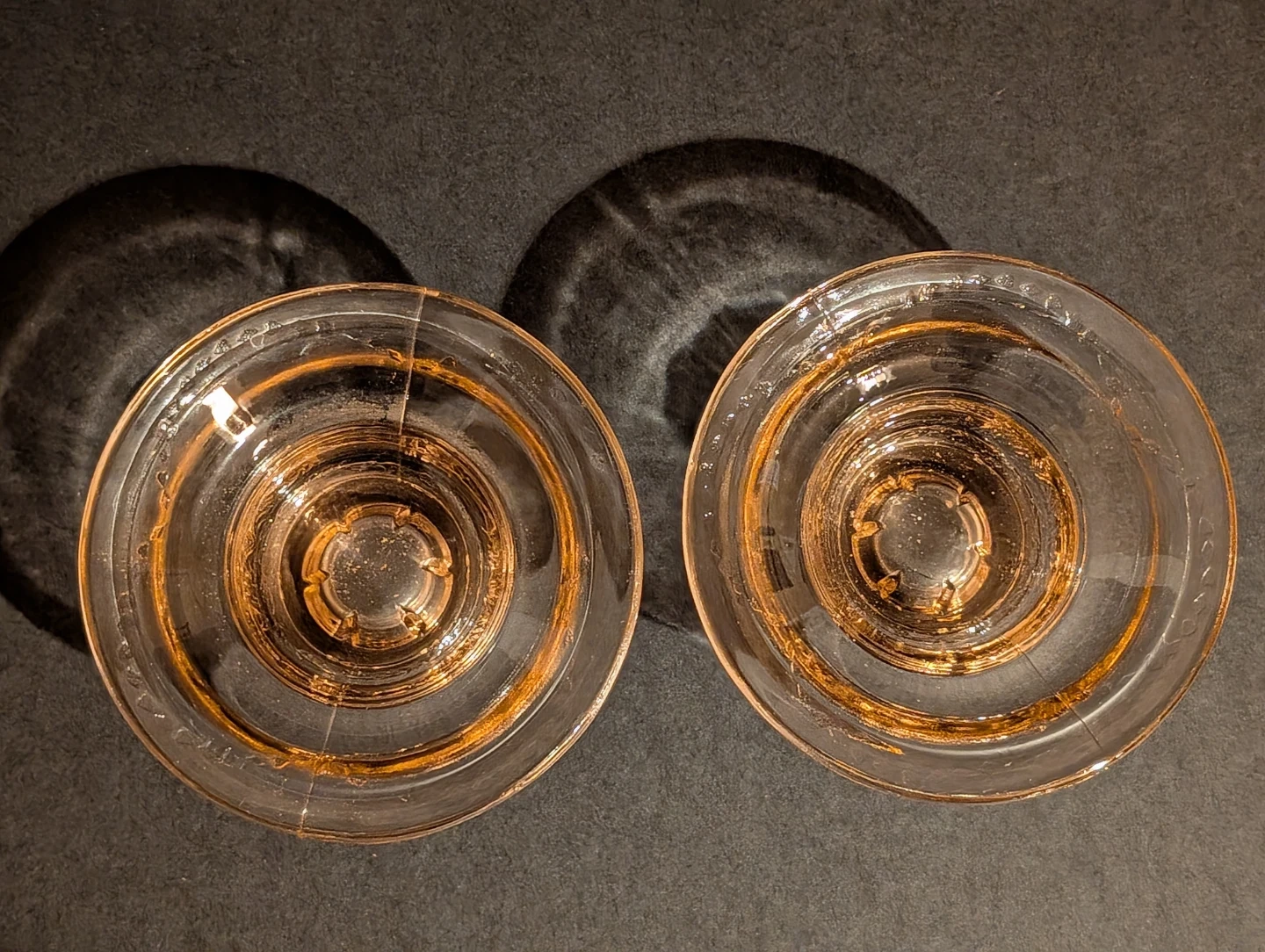 This is a pair of vintage pink glass candlestick holders. They are not from the original 1930s Madrid run but this pink version was part of the "Recollection" done in the mid 80s, still easily and beautifully fitting them into the vintage category. They are in perfect condition and feature a decorative embossed design. Perfect for adding a touch of elegance to any table setting!