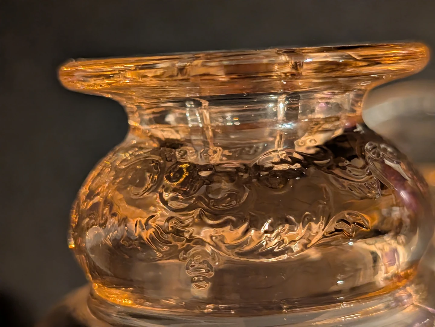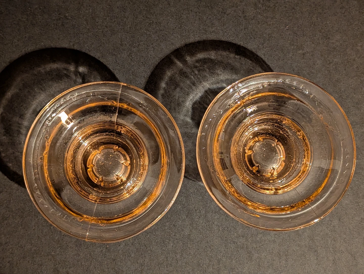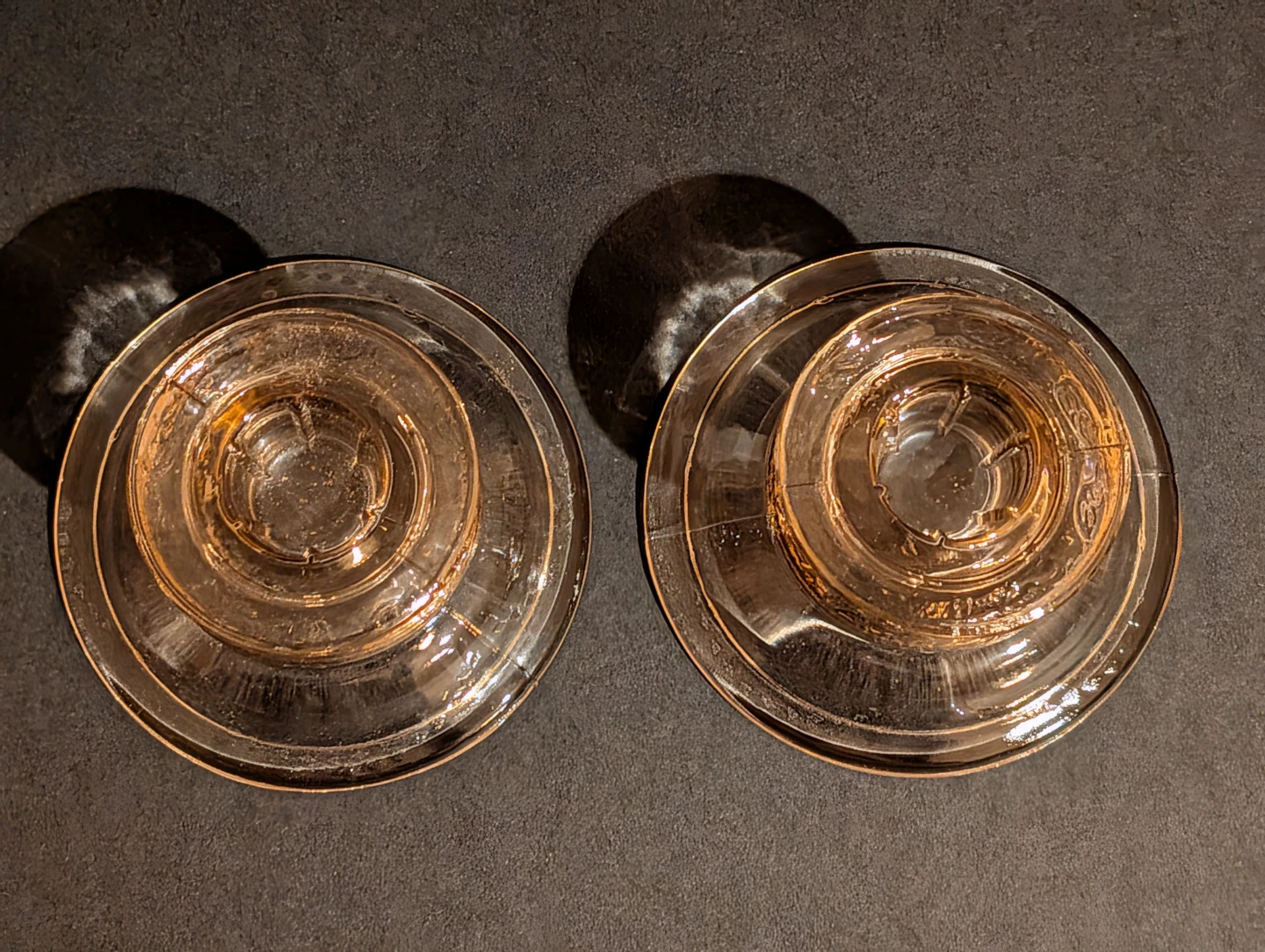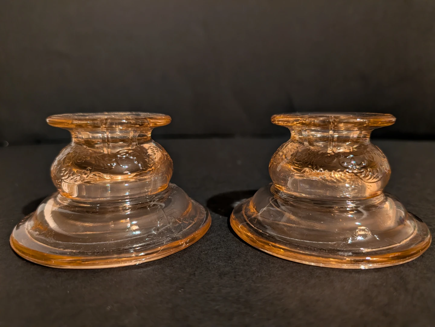 This is a pair of vintage pink glass candlestick holders. They are not from the original 1930s Madrid run but this pink version was part of the "Recollection" done in the mid 80s, still easily and beautifully fitting them into the vintage category. They are in perfect condition and feature a decorative embossed design. Perfect for adding a touch of elegance to any table setting!