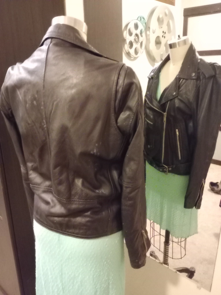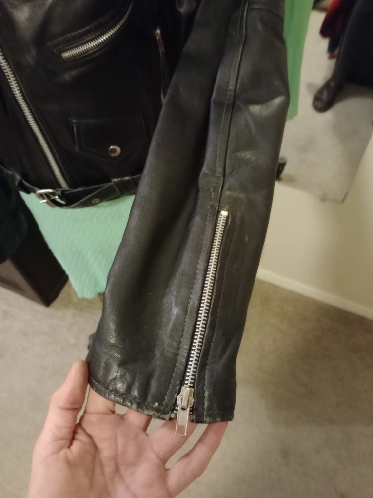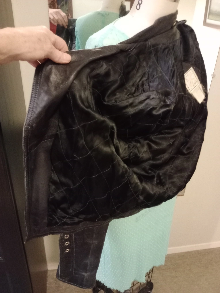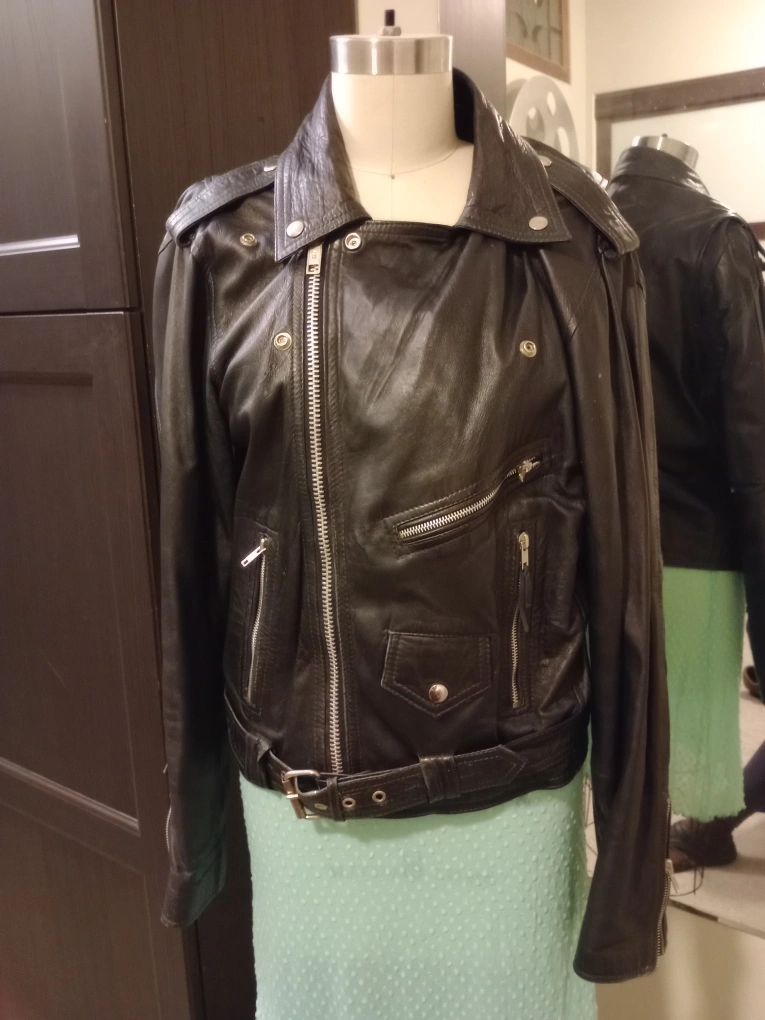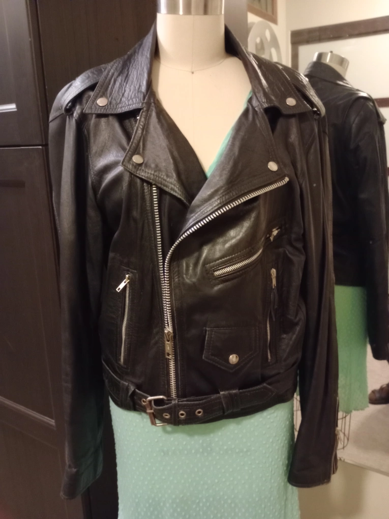 Black leather jacket with zipper closure, snap collar, multiple pockets, and a belt.