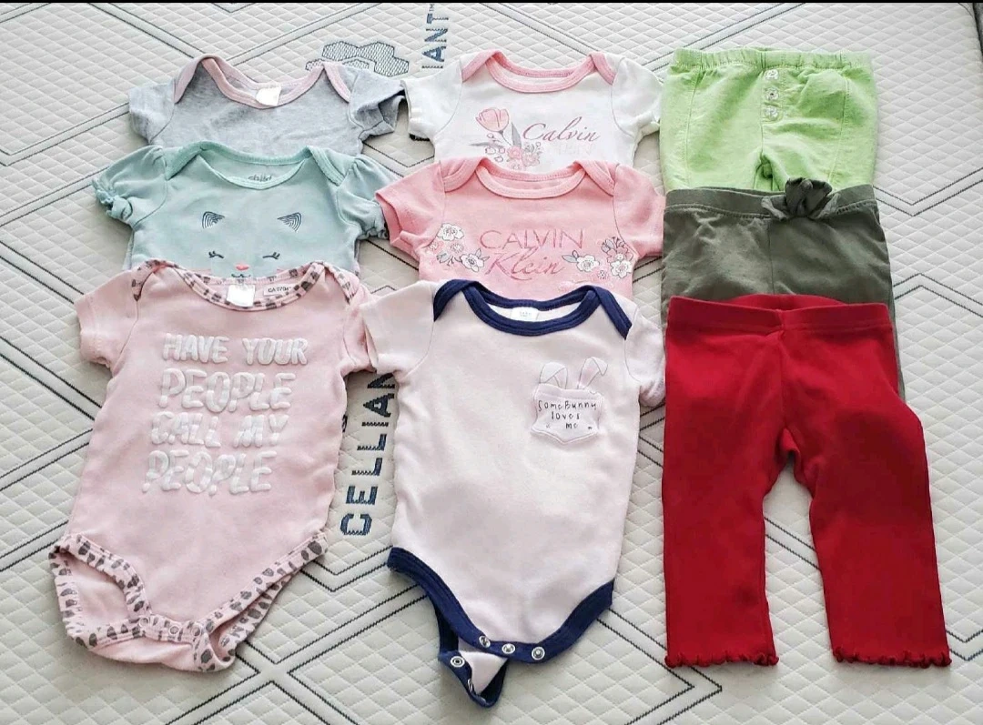 This bundle includes a variety of baby onesies and pants. Two onesies are from Calvin Klein, featuring floral designs. One onesie has "HAVE YOUR PEOPLE CALL MY PEOPLE" text. Another onesie has a bunny pocket detail. Also includes green and red pants, with one pair having button details. Size 3-6 months.