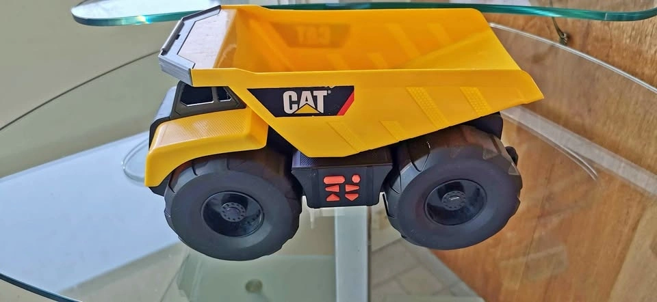 This is a motorized Toy State Caterpillar Dump Truck, a construction toy with realistic lights and sounds. It features classic CAT styling, working lights, construction tunes, and foreman vocals. Powered by batteries for motor sounds and lights. Designed for indoor and outdoor play. Needs 3 AA batteries. The truck moves forward and backward, and the dump bed operates with motorized features for lifting and lowering. Width is 1ft, height is 7 inches.