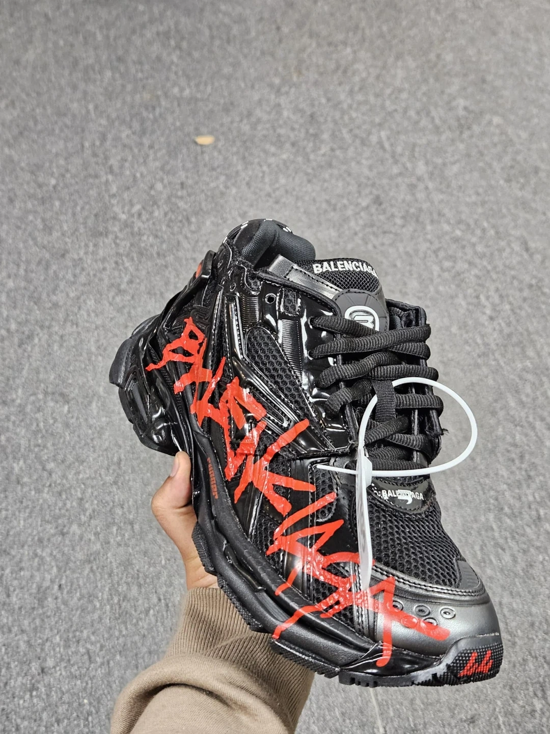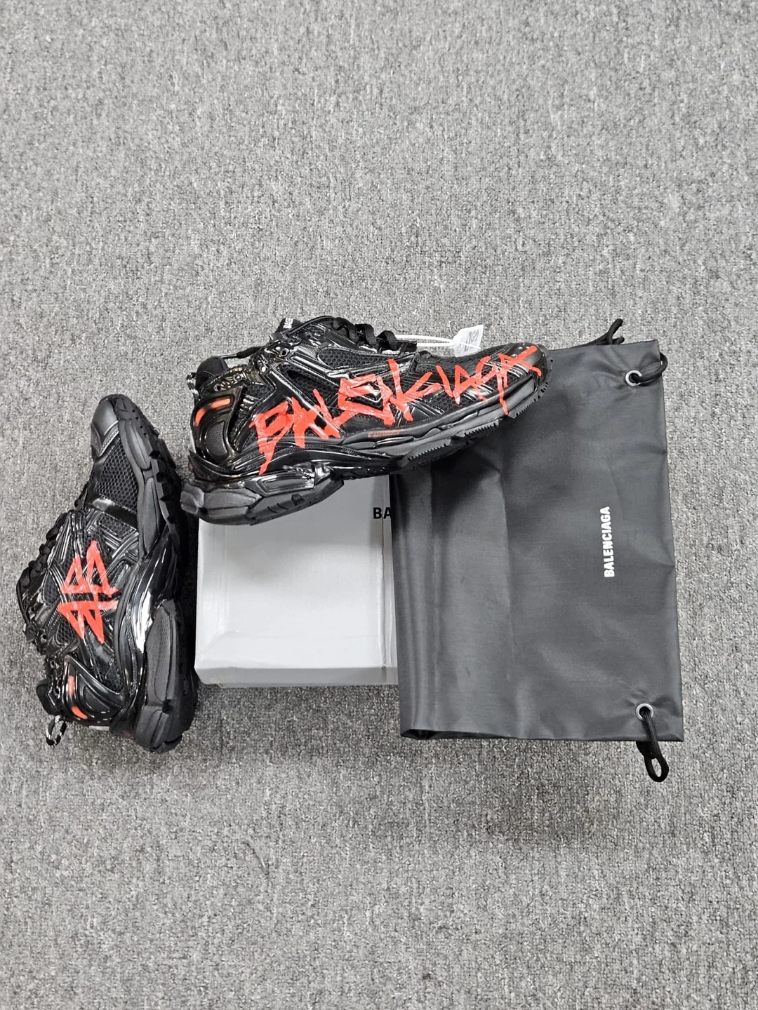 These Balenziaga Runner sneakers are available in white with black graffiti detailing or black with red graffiti accents. They include the original box and dust bag. Perfect for adding a statement to your streetwear collection!