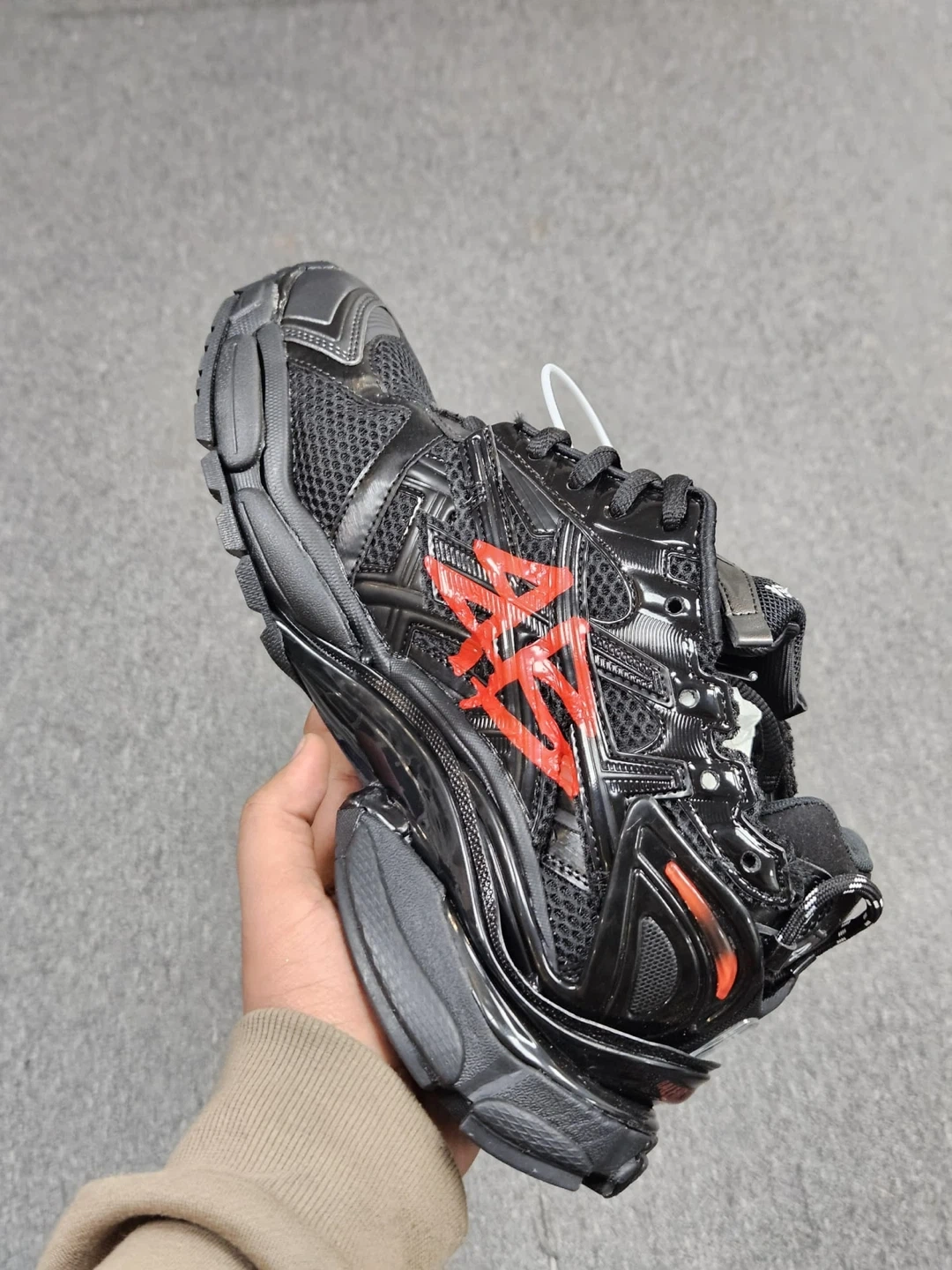 These Balenziaga Runner sneakers are available in white with black graffiti detailing or black with red graffiti accents. They include the original box and dust bag. Perfect for adding a statement to your streetwear collection!