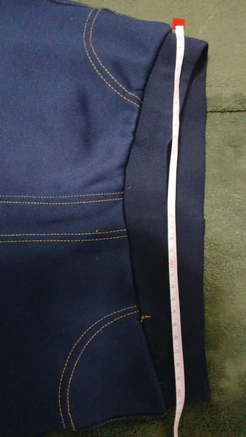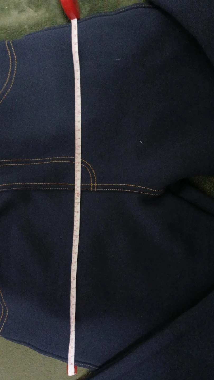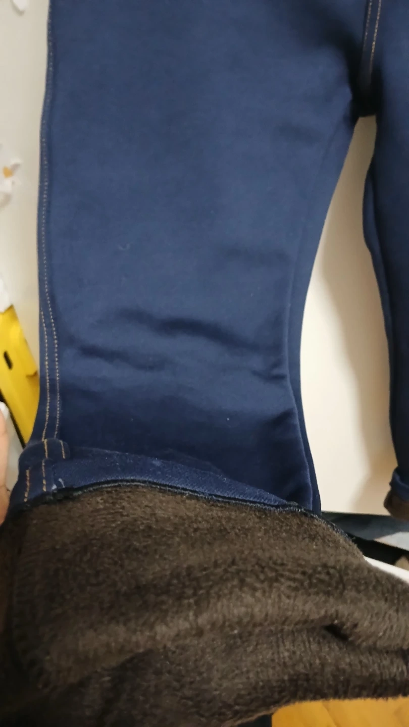Cozy navy blue leggings with a fleece lining. These pants have a comfortable elastic waistband and faux front pockets. They're designed for warmth and casual wear. Waist measures approximately 30 cm, inseam is about 40 cm.