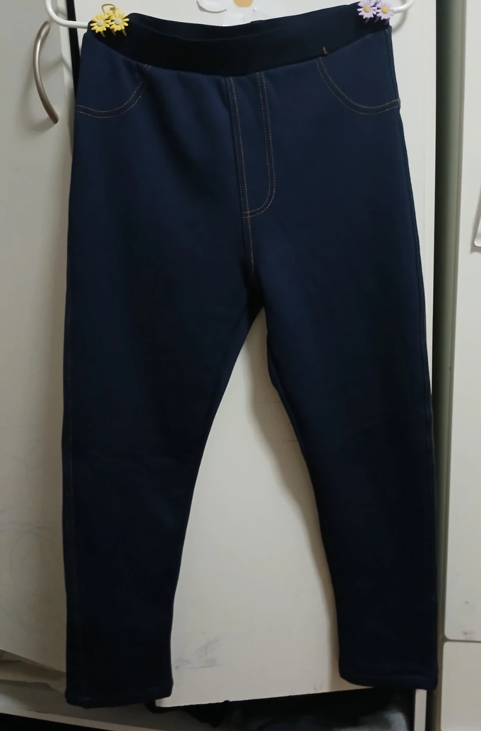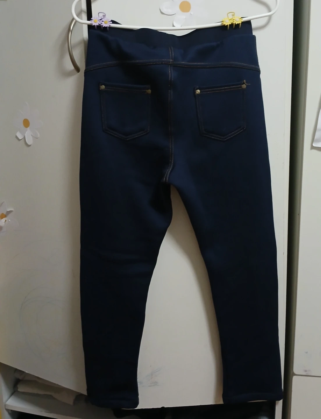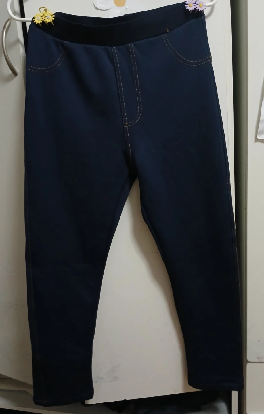 Cozy navy blue leggings with a fleece lining. These pants have a comfortable elastic waistband and faux front pockets. They're designed for warmth and casual wear. Waist measures approximately 30 cm, inseam is about 40 cm.