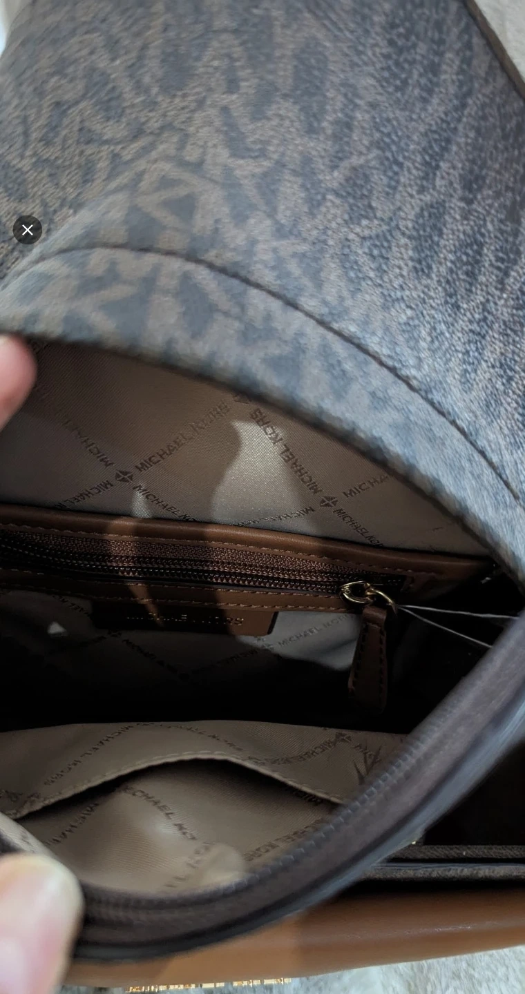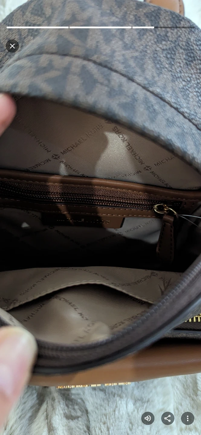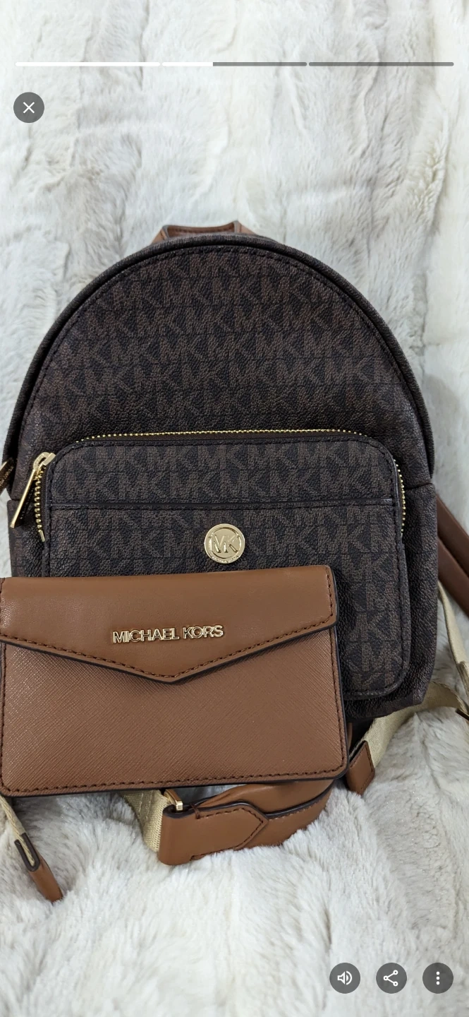 This is a Michael Kors backpack and matching wallet set. It features the signature MK pattern in brown with gold hardware. The backpack has adjustable straps and multiple compartments. The wallet is removable.