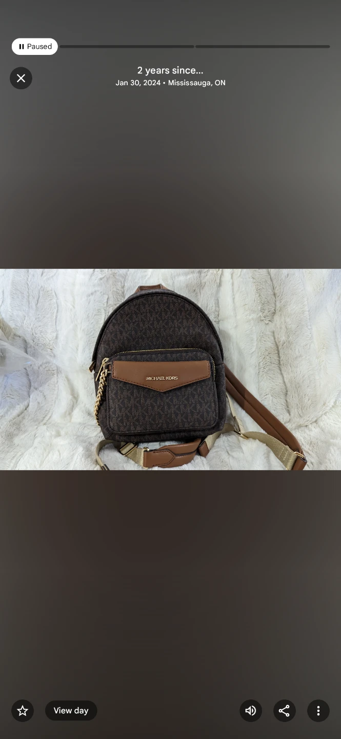 This is a Michael Kors backpack and matching wallet set. It features the signature MK pattern in brown with gold hardware. The backpack has adjustable straps and multiple compartments. The wallet is removable.