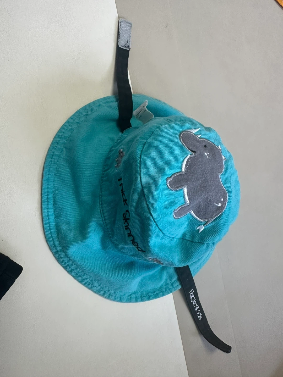 This Frugi kids sun hat features a fun tiger design on one side and an elephant on the other. It has a wide brim for sun protection and an adjustable chin strap. Made from cotton.