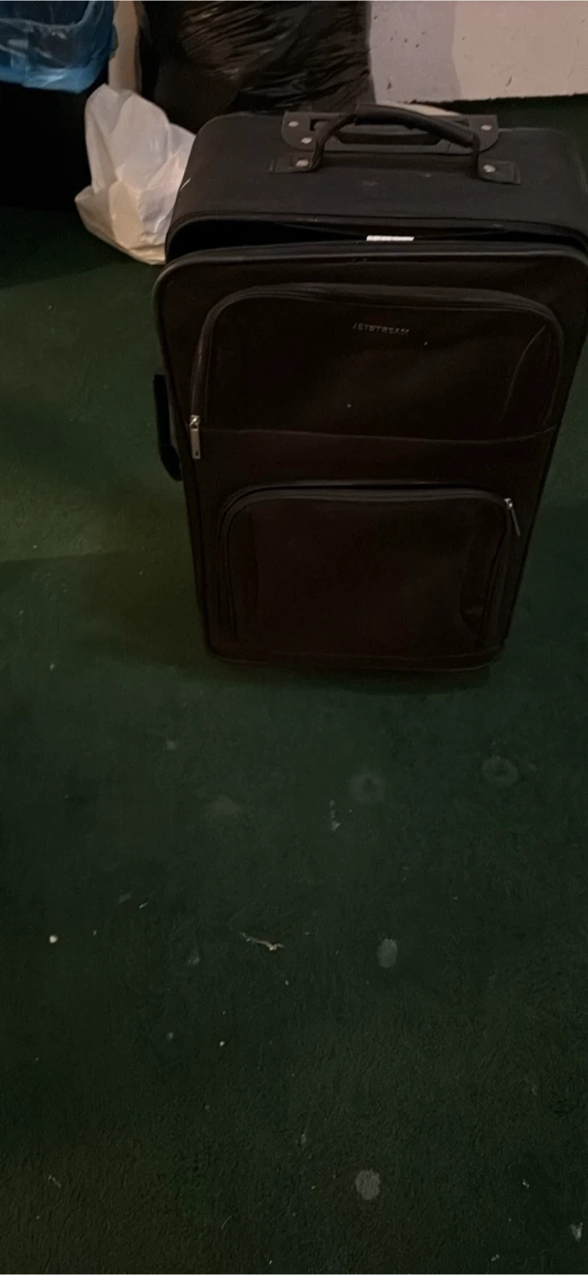 This Jetstream suitcase is black and made of soft-shell material. It's a great size for weekend trips! It has multiple zippered compartments for organization.