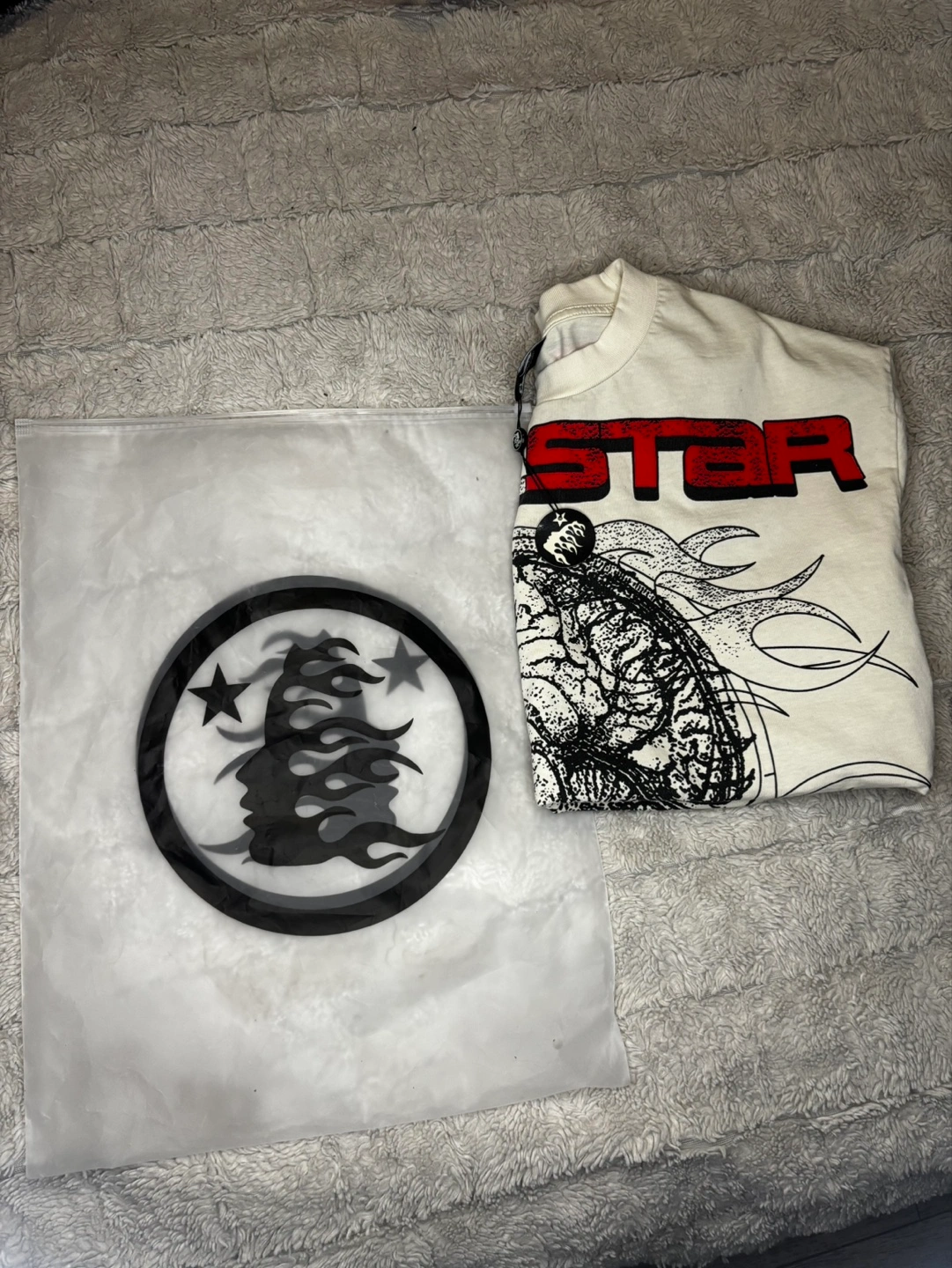 Two Hellstar graphic tees. One black, one off-white. Unique designs. Short sleeves. Crew neck.
