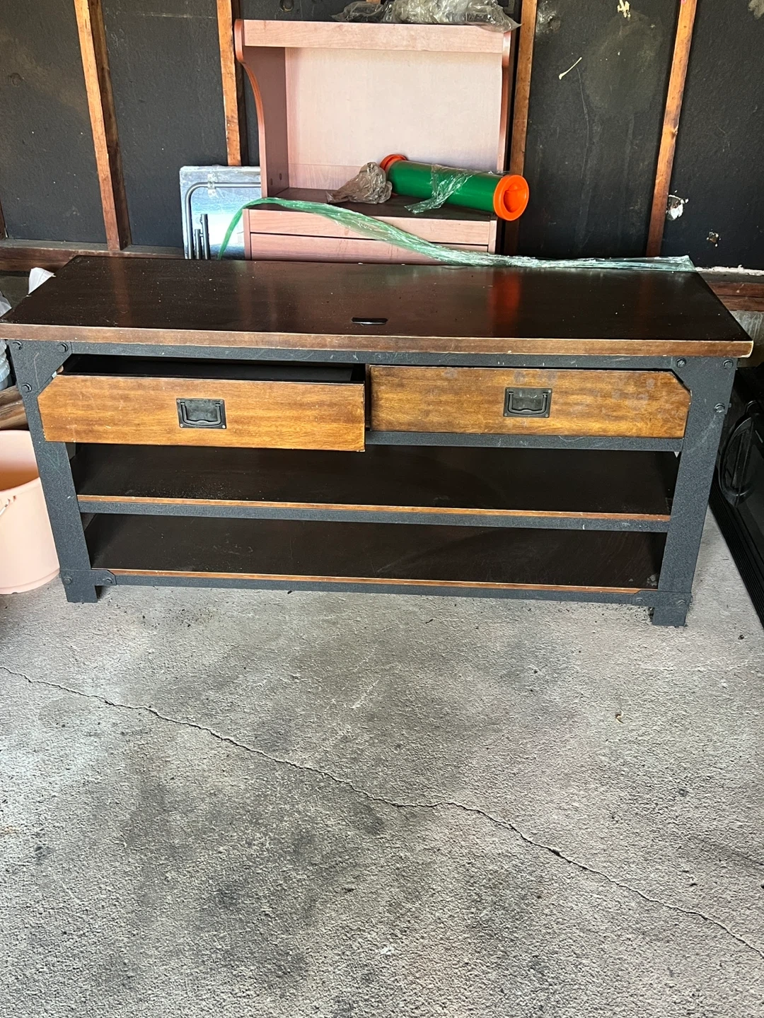 This media console features two drawers and open shelving below. It has a dark wood top and drawers with metal hardware, supported by a black metal frame. Dimensions are approximately 40" W x 18" D x 20" H. Perfect for holding media equipment or as general storage.