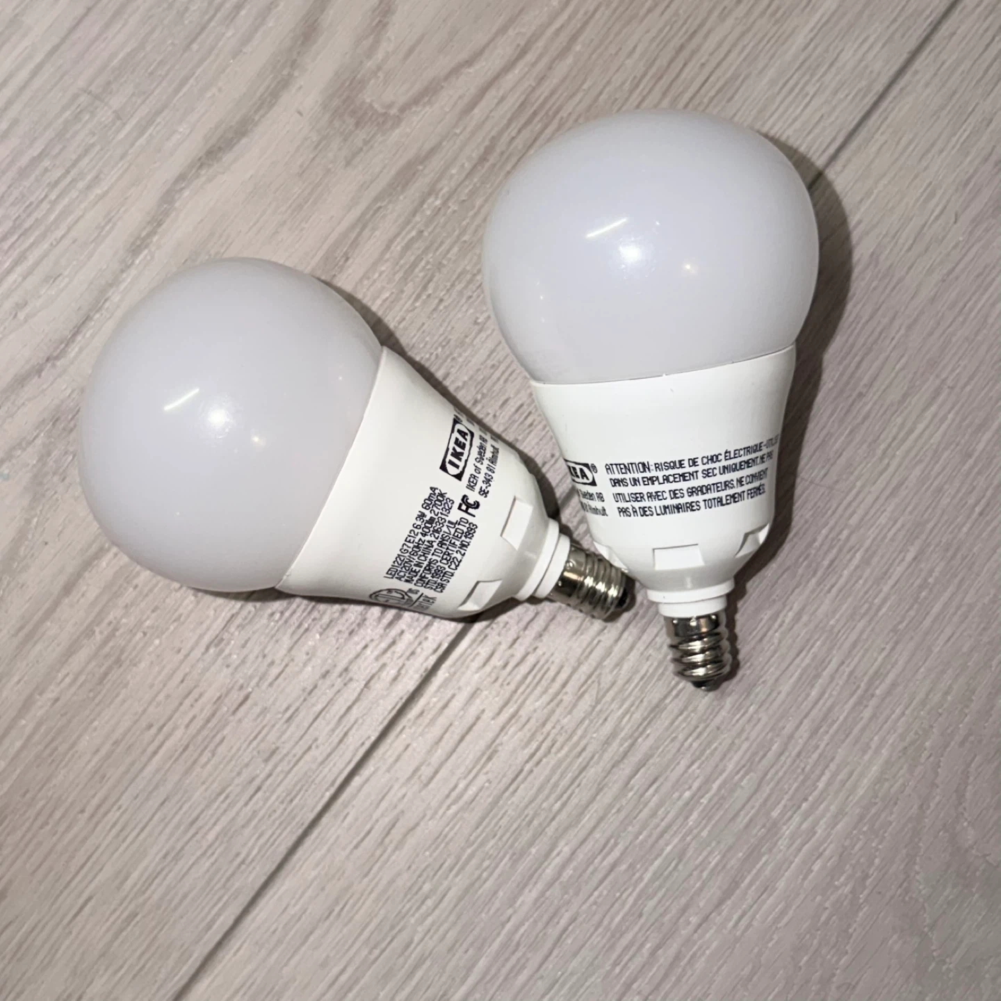 Two IKEA LED light bulbs. Each is 6.3W and 60mA. These are E12 base bulbs and are suitable for use in dry locations only. Not for use with dimmers or in totally enclosed fixtures.