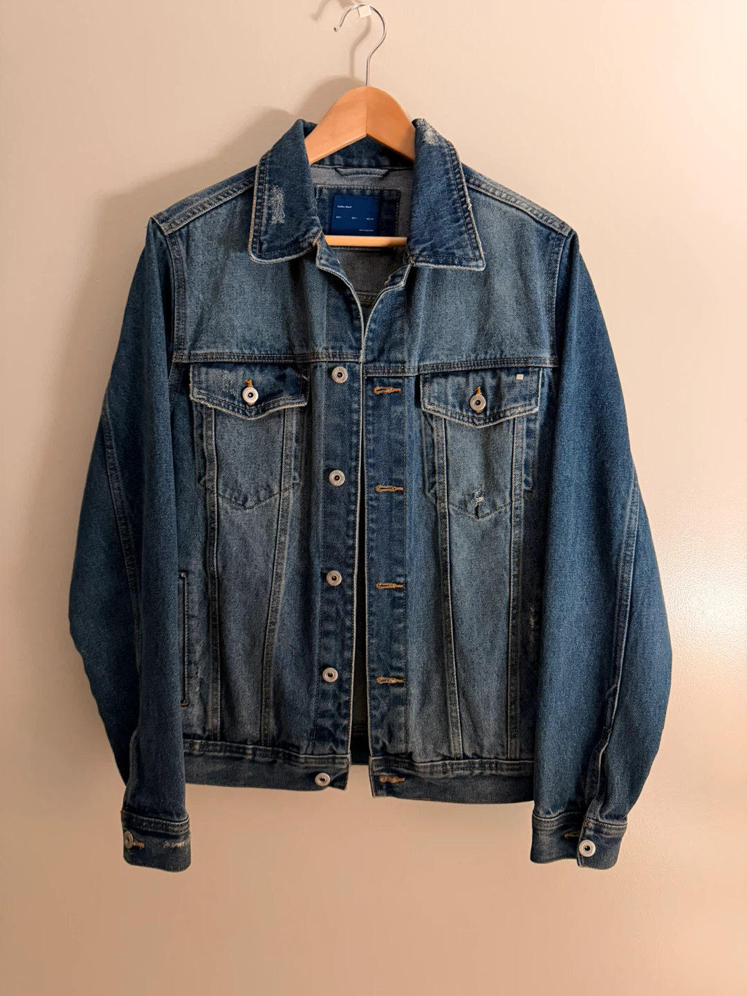 This is a classic blue denim jacket from Zara. It features a button-up front and two chest pockets. Made with durable denim material.