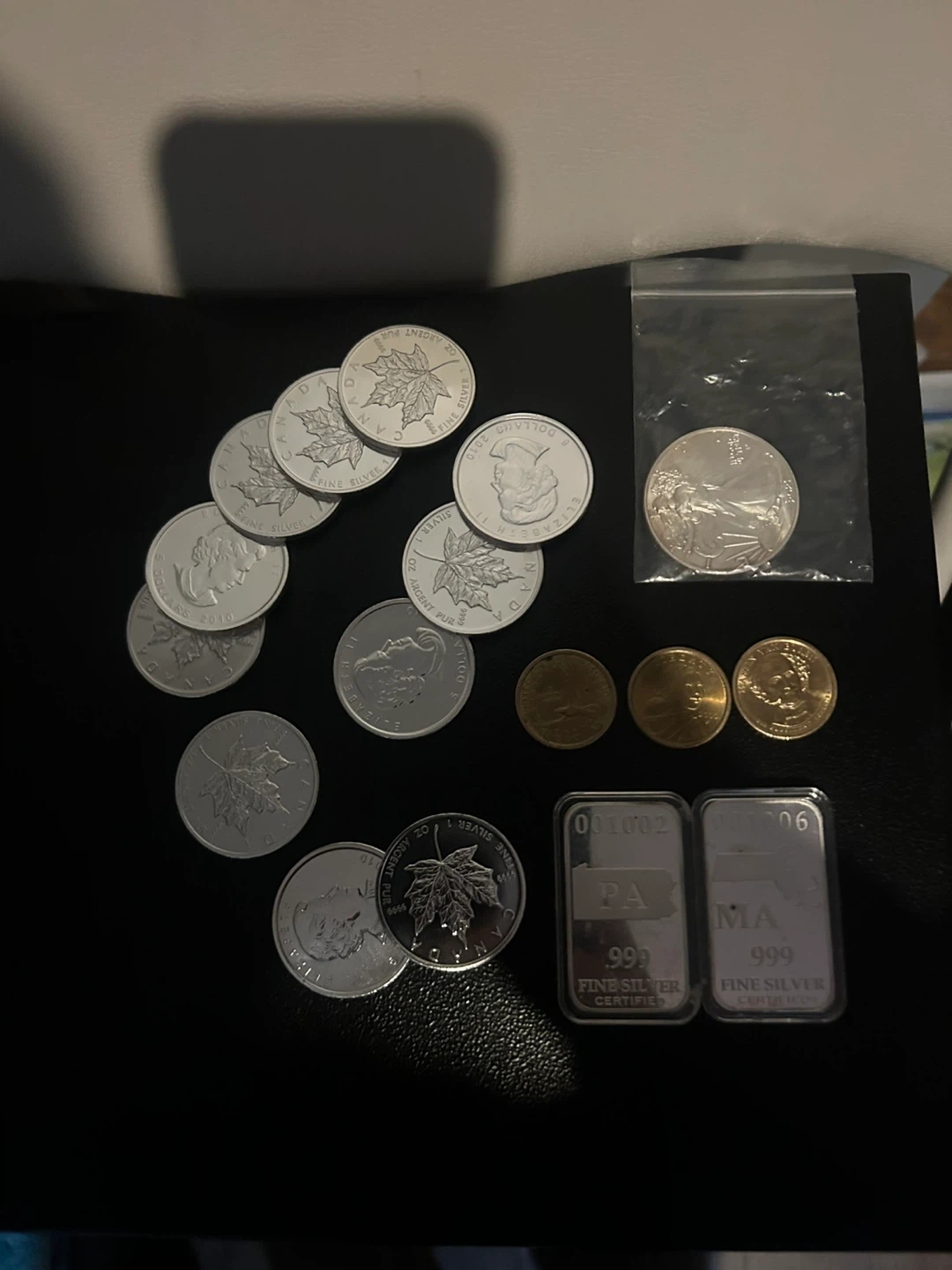Lot includes Canadian Maple Leaf silver coins and Pennsylvania Treasury silver bars. Coins are 1 oz fine silver. Bars are .999 fine silver. Also includes a US Silver Eagle coin.