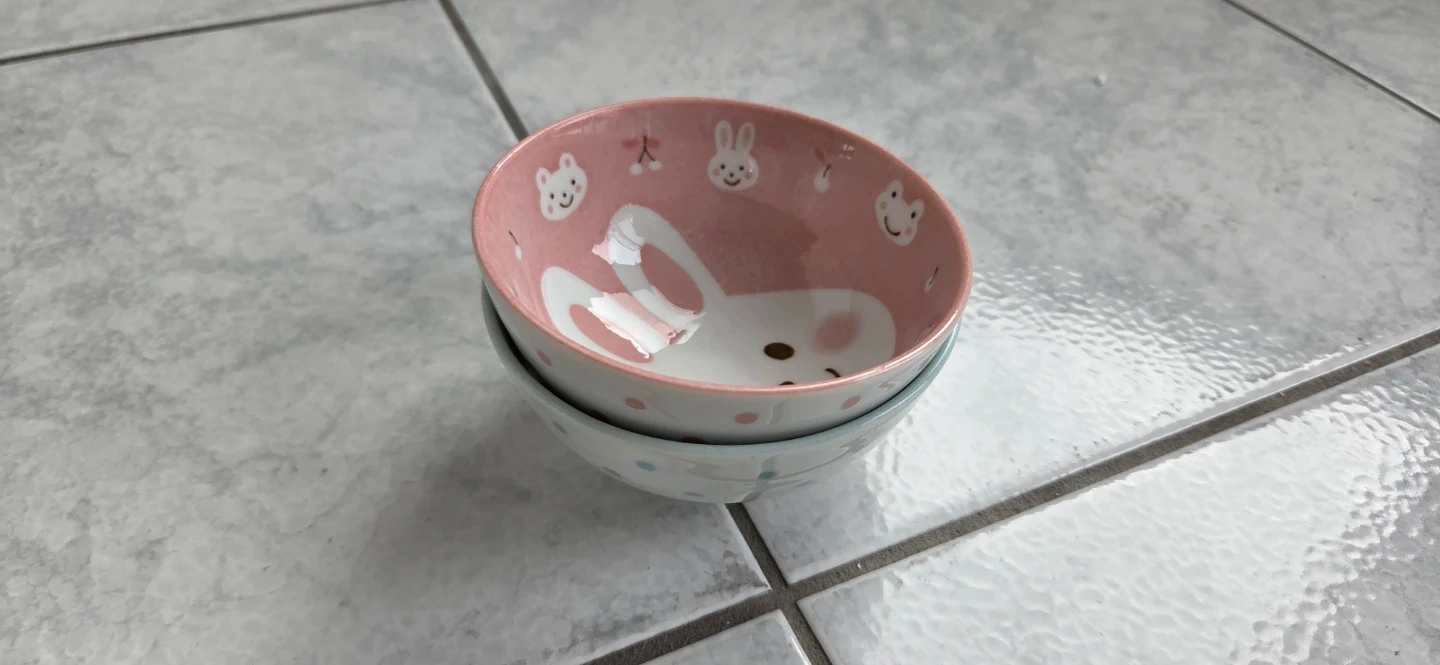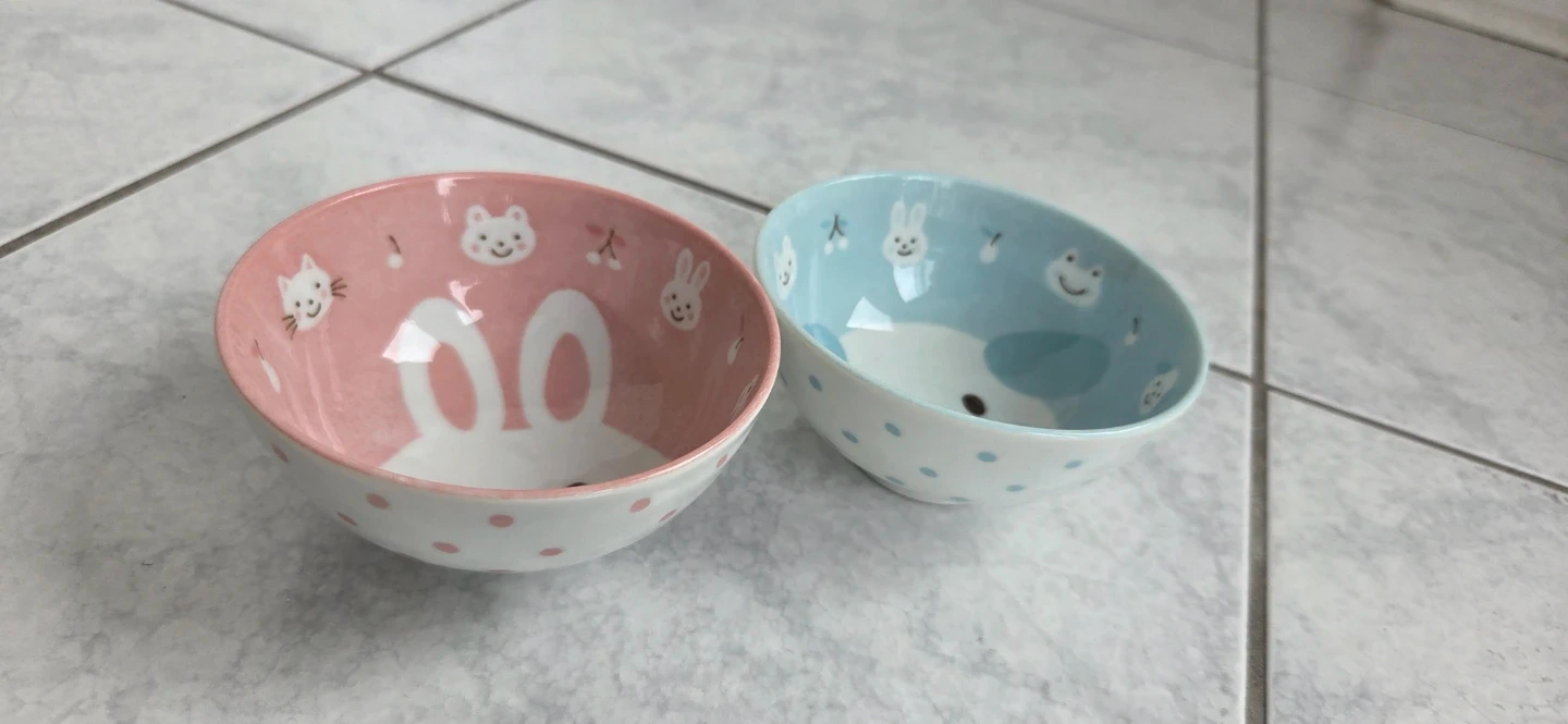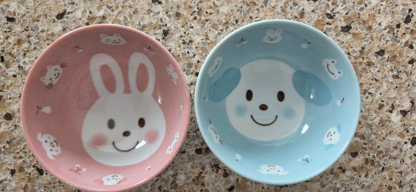 This set includes a pink bowl with a bunny design and a blue bowl with a puppy design. They're perfect for serving snacks or small meals to kids!