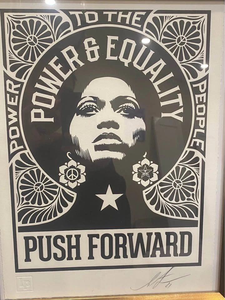 Authentic Shepard Fairey (Obey) “Power & Equality / Push Forward” print, framed in a gold frame.