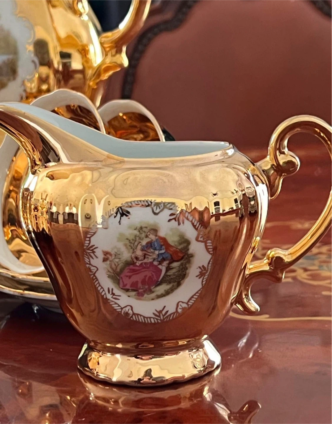 This is a shiny gold-tone creamer pitcher featuring a framed romantic pastoral scene. It has an elegant handle and a decorative base. This pitcher would be lovely for serving cream or sauces.