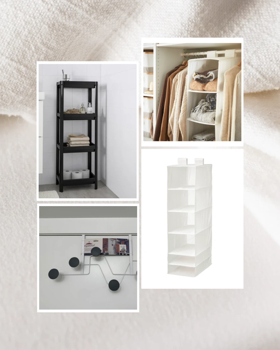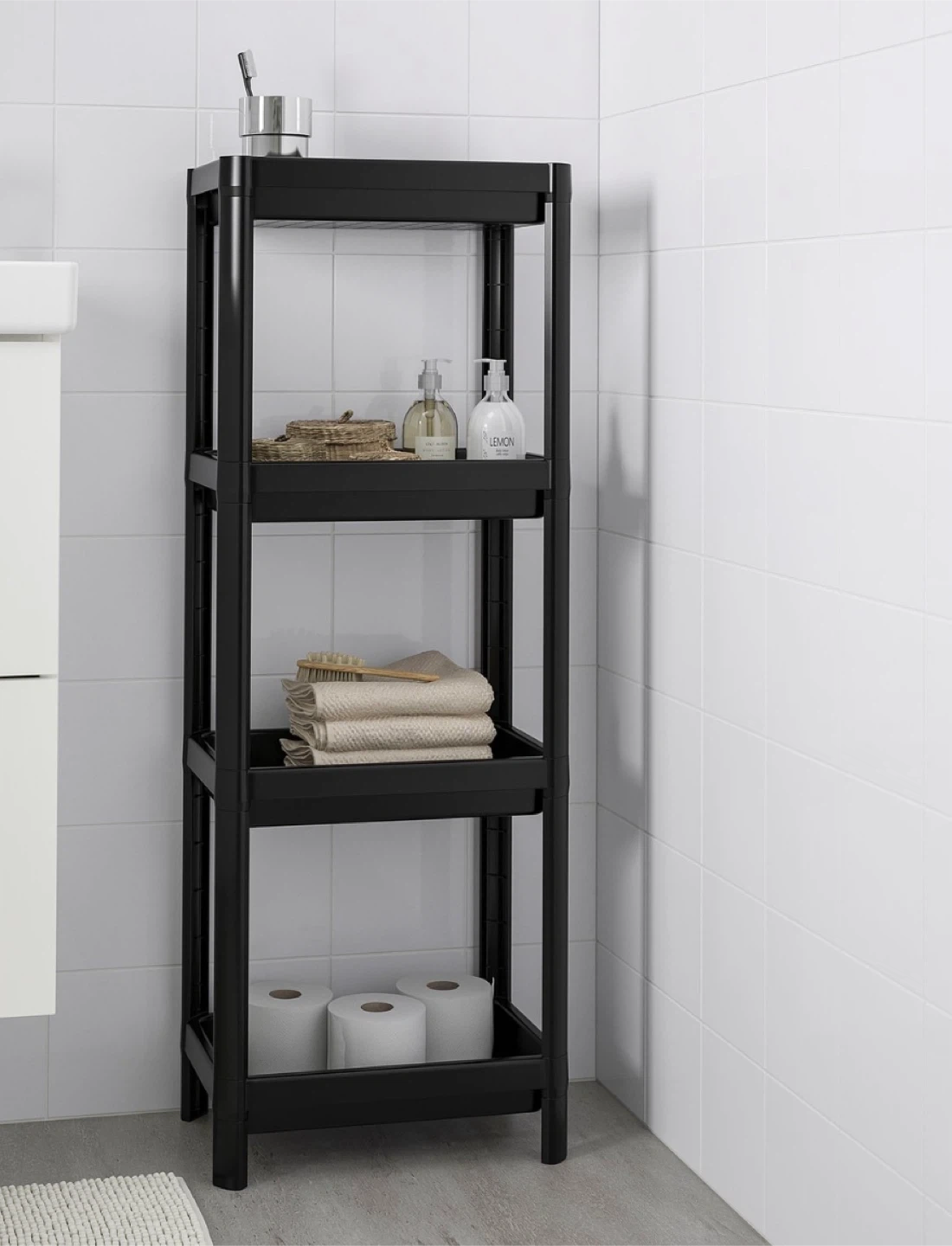 • Compact black plastic storage organizer. Strong and sturdy, perfect for laundry room, bathroom, pantry, or small spaces. Ideal for storing cleaning supplies, towels, toilet paper, or daily essentials. Easy to assemble and disassemble. - $10