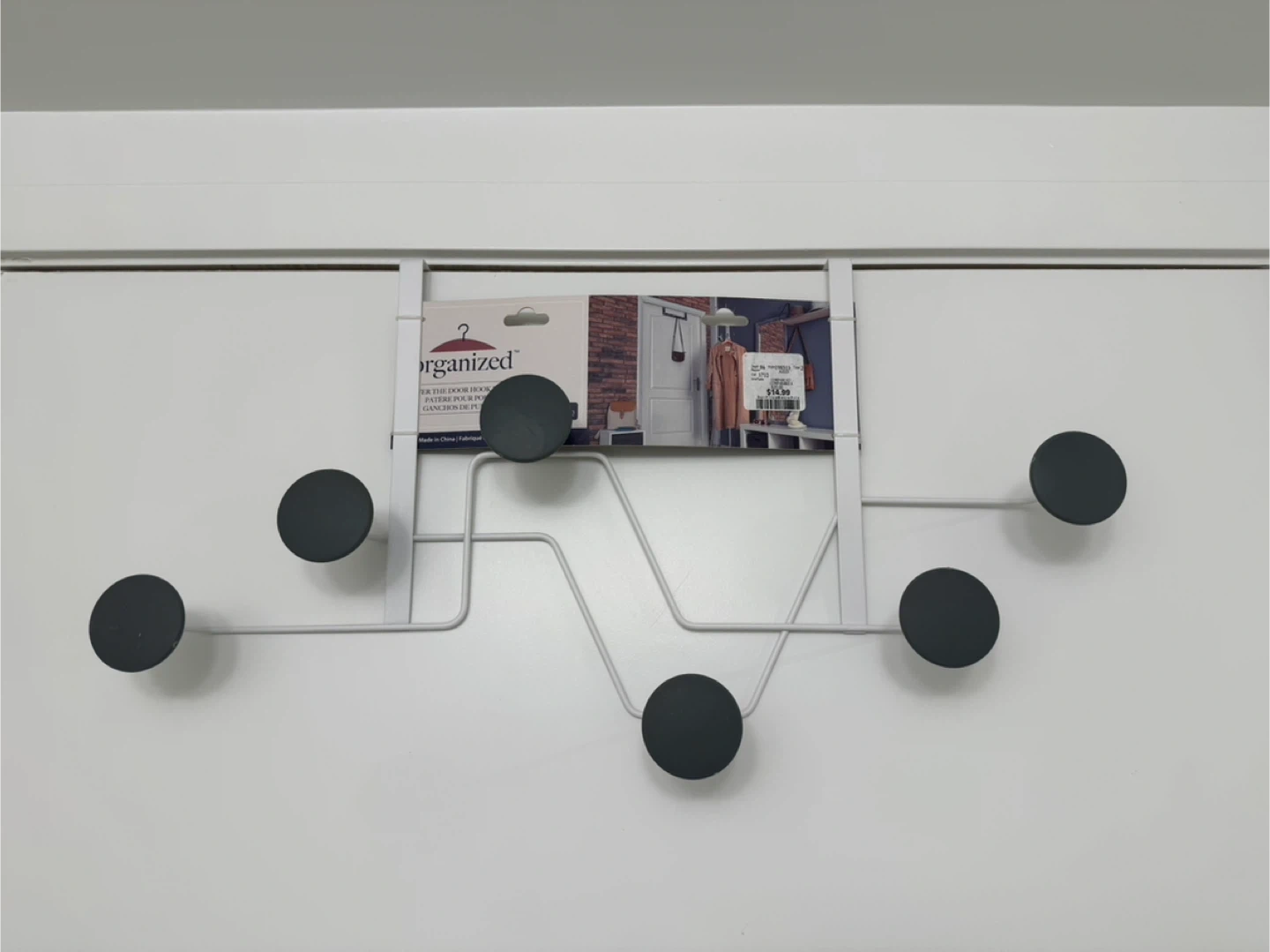 • Over-the-door hook organizer with multiple round hooks. Strong and sturdy metal design, perfect for hanging coats, bags, towels, scarves, or accessories. Fits easily over most doors, no drilling required. -$10