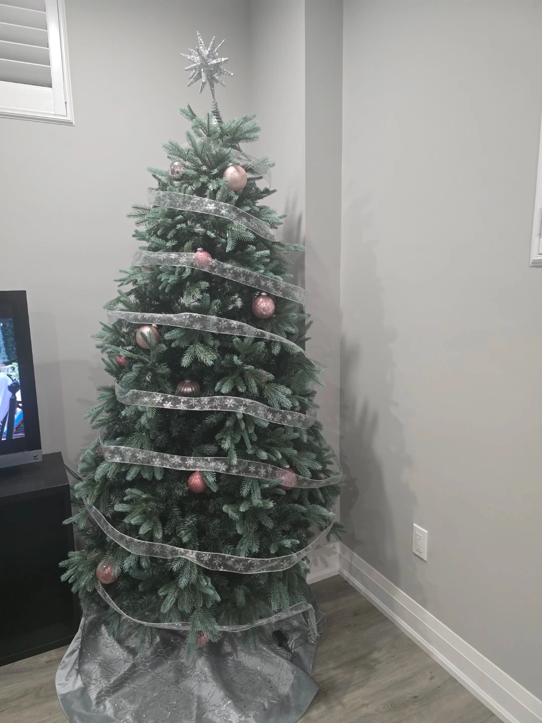 It's a Christmas tree. Features a silver snowflake ribbon and pink ornaments. Includes a star topper and a decorative tree skirt. It's ready for your holiday display!