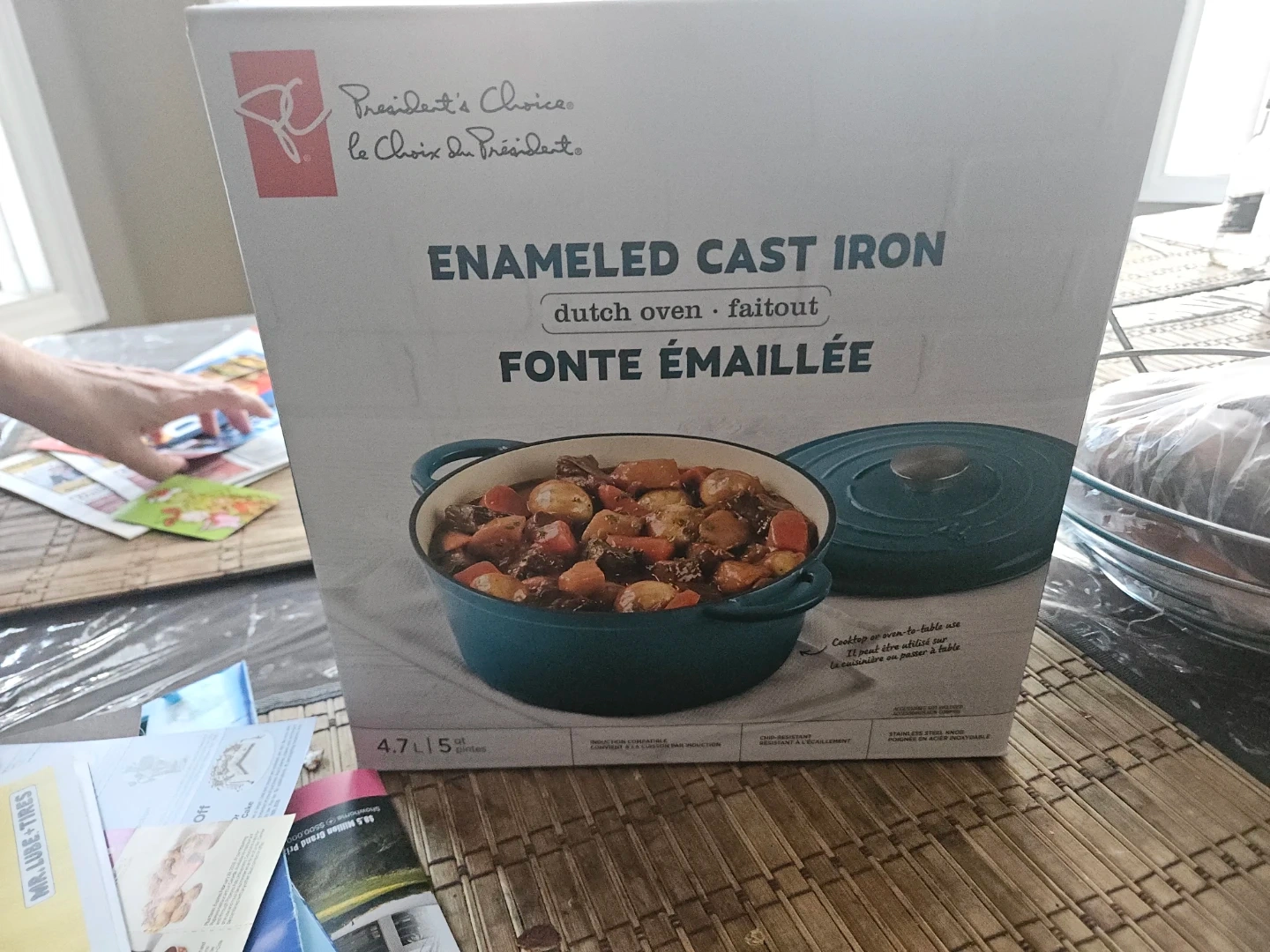 Selling a President's Choice enameled cast iron dutch oven. It's a 4.7L/5 Pintes size and comes in its original box. The dimensions are 32.3 cm x 26 cm x 17 cm (12.7 in/po x 10.2 in/po x 6.69 in/po). This dutch oven offers superior heat retention and even heat distribution, making it ideal for slow-simmered soups and braised meats