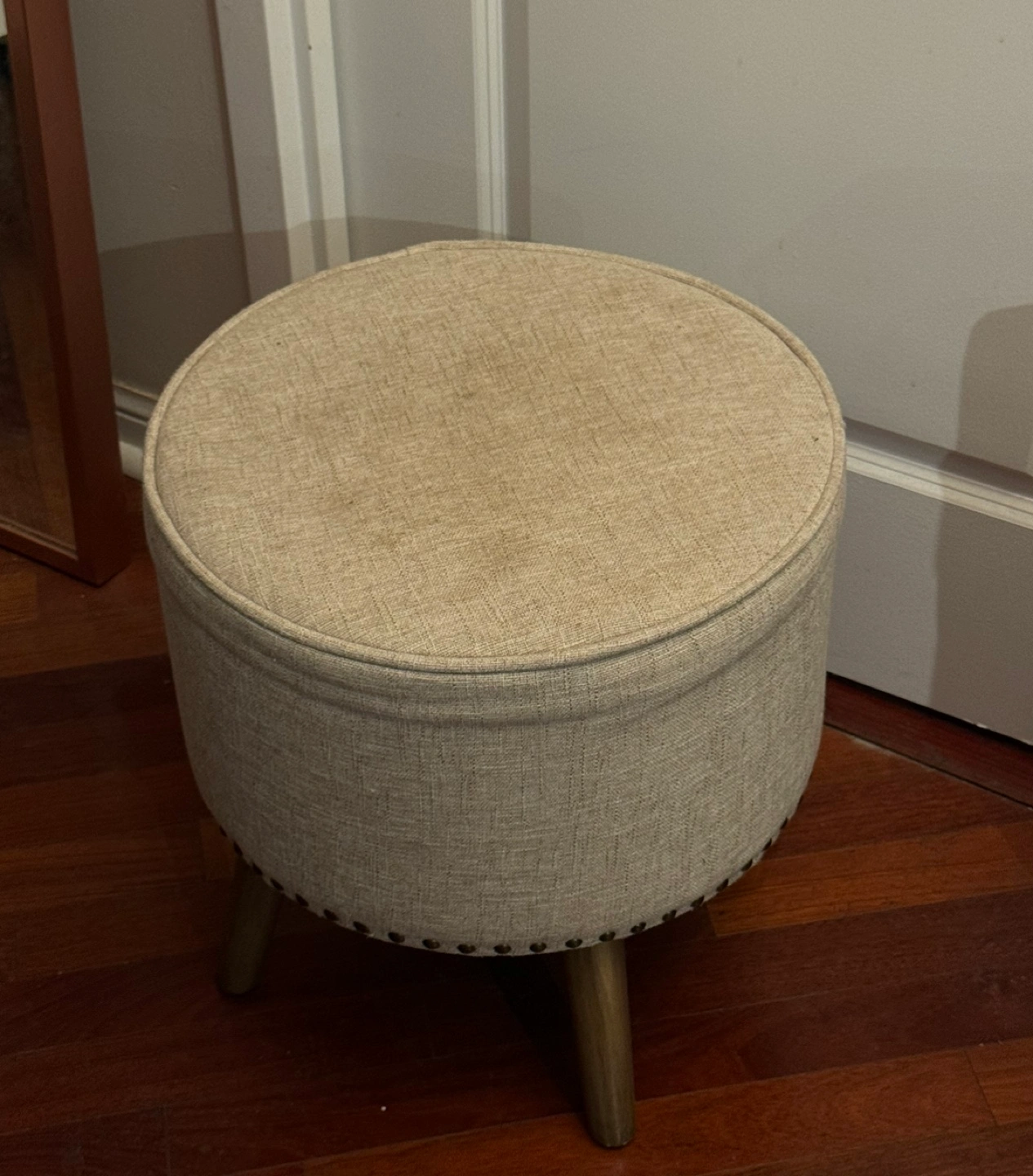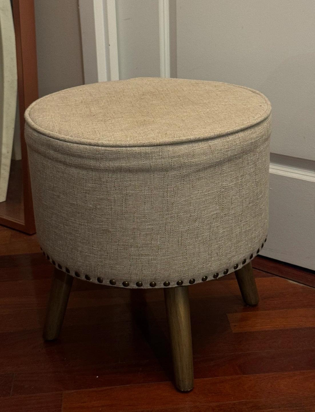 Round ottoman with wood legs. Features a beige fabric cover and nail head trim. Perfect for extra seating or a foot rest.