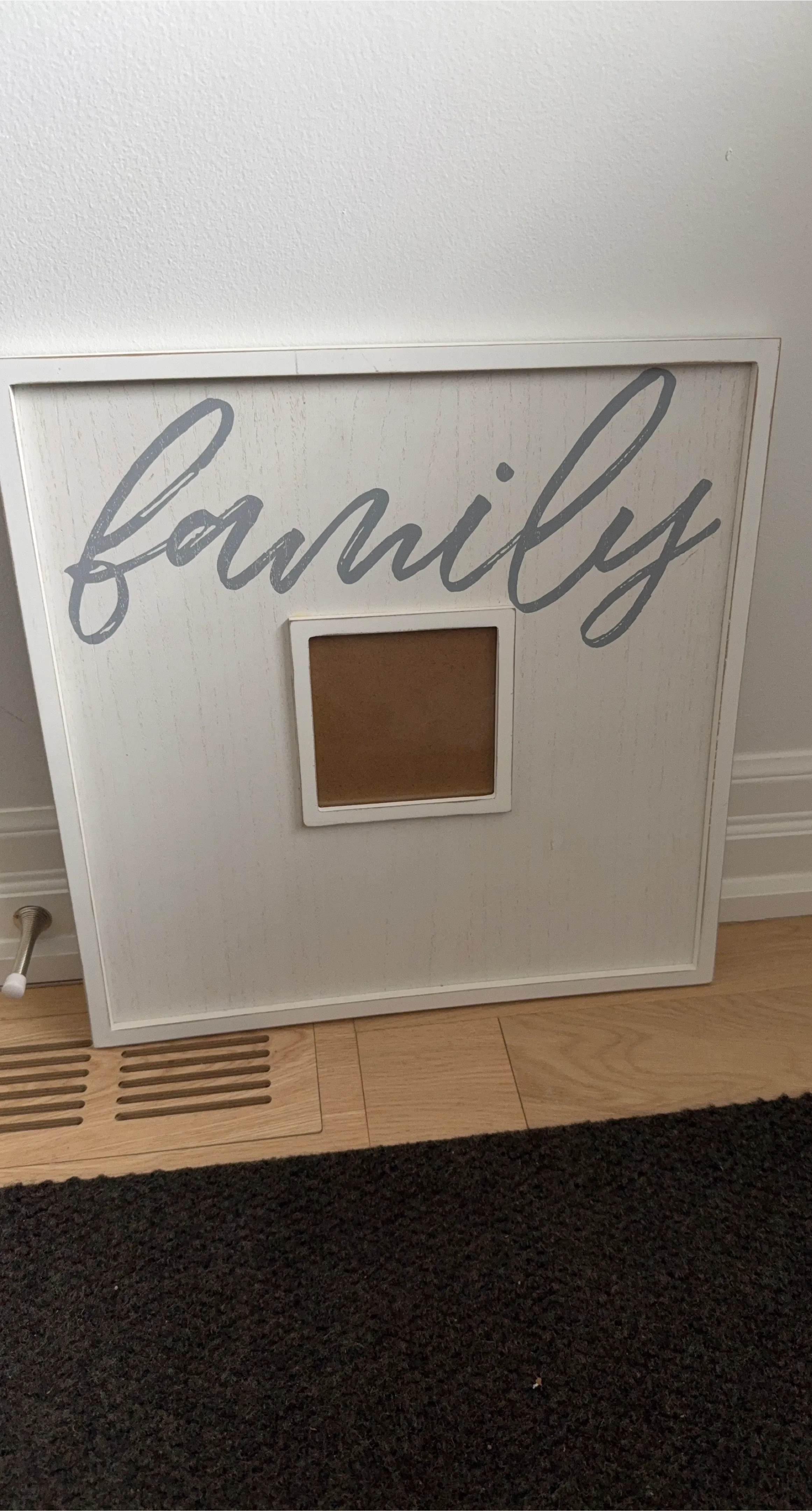 White wooden frame with "family" text in grey script. Features a central opening for a photo. This frame is great for displaying cherished family memories!