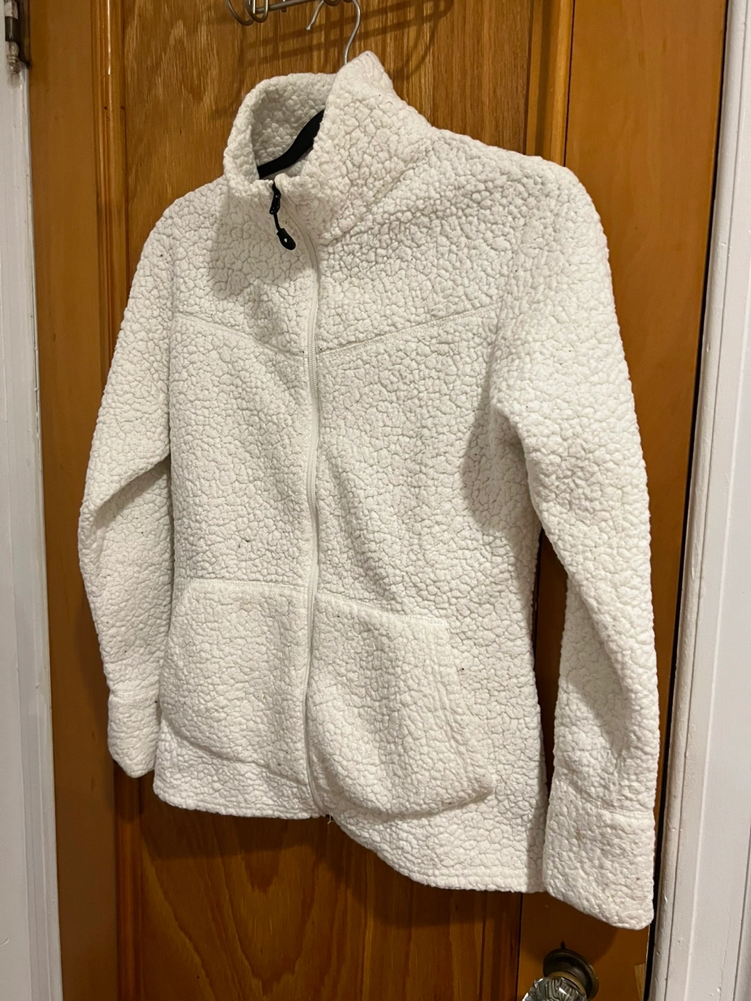 Four-piece women's clothing bundle. Includes a cream faux fur vest with a belt, a multicolored knit beanie with a pompom, an off-white fleece jacket, and a pink cable knit sweater. Perfect for fall and winter.