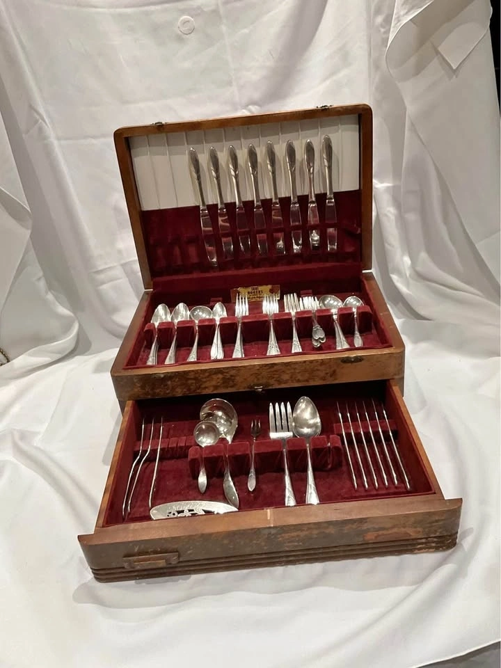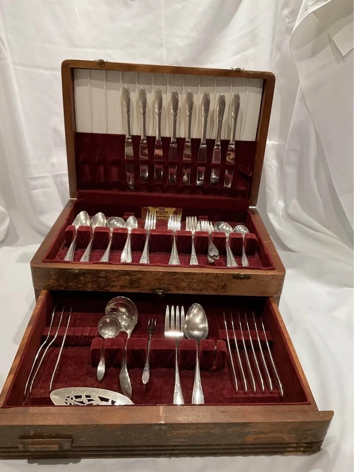Classic 1881 Rogers Oneida Silver Plated ART DECO “Community Plate”. Original Box. Pattern: Lady Hamilton. 75 Pieces. Knives: 8, Large Spoons: 8, Soup Spoons: 8, Teaspoons: 9, Dinner Forks: 12, Dessert Forks: 12, Butter Spreaders: 6, Master Butter Knife: 2, Cake Server: 1, Serving Spoons: 2, Sugar Spoons: 3, Medium Ladle: 1, Small Ladle: 1, Serving Fork: 1. This is a vintage art deco set - a set this large is rare in its original case. Smoke & Pet Free Home. Cash Only - Richmond Hill / Bathurst & King Rd.
