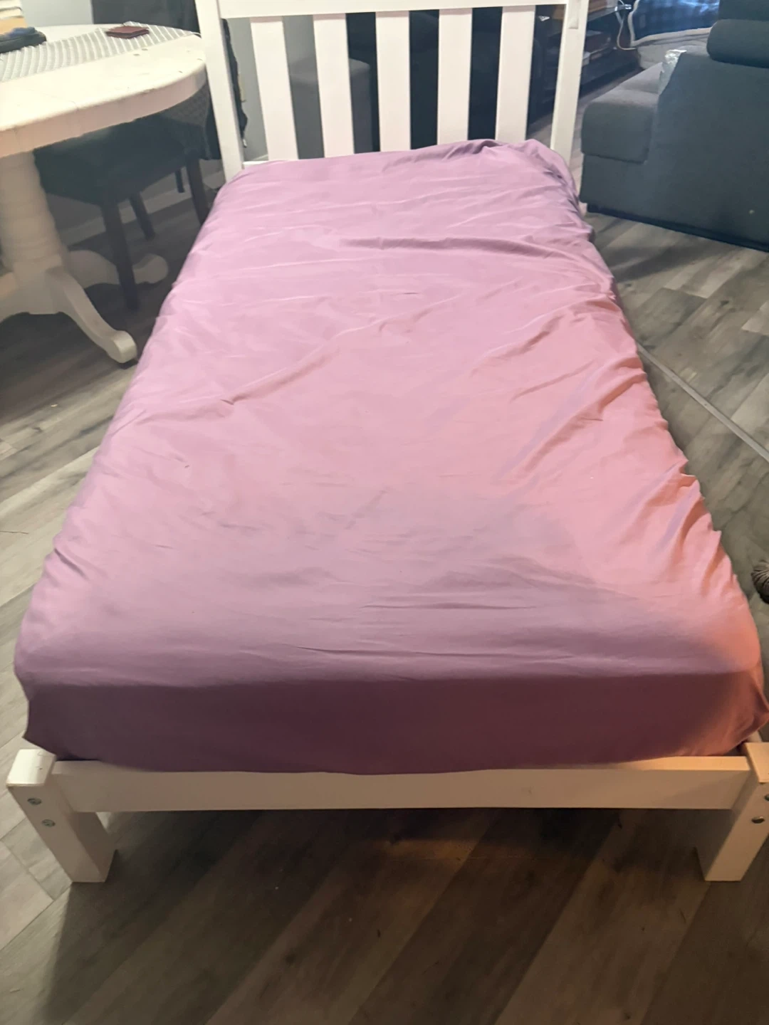 This is a simple white twin bed frame. It comes with a pink mattress cover already on it. This bed would be great for a child's room or a guest room.