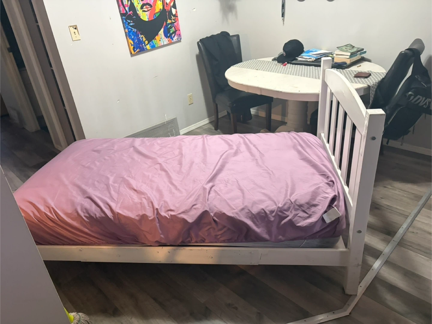 This is a simple white twin bed frame. It comes with a pink mattress cover already on it. This bed would be great for a child's room or a guest room.