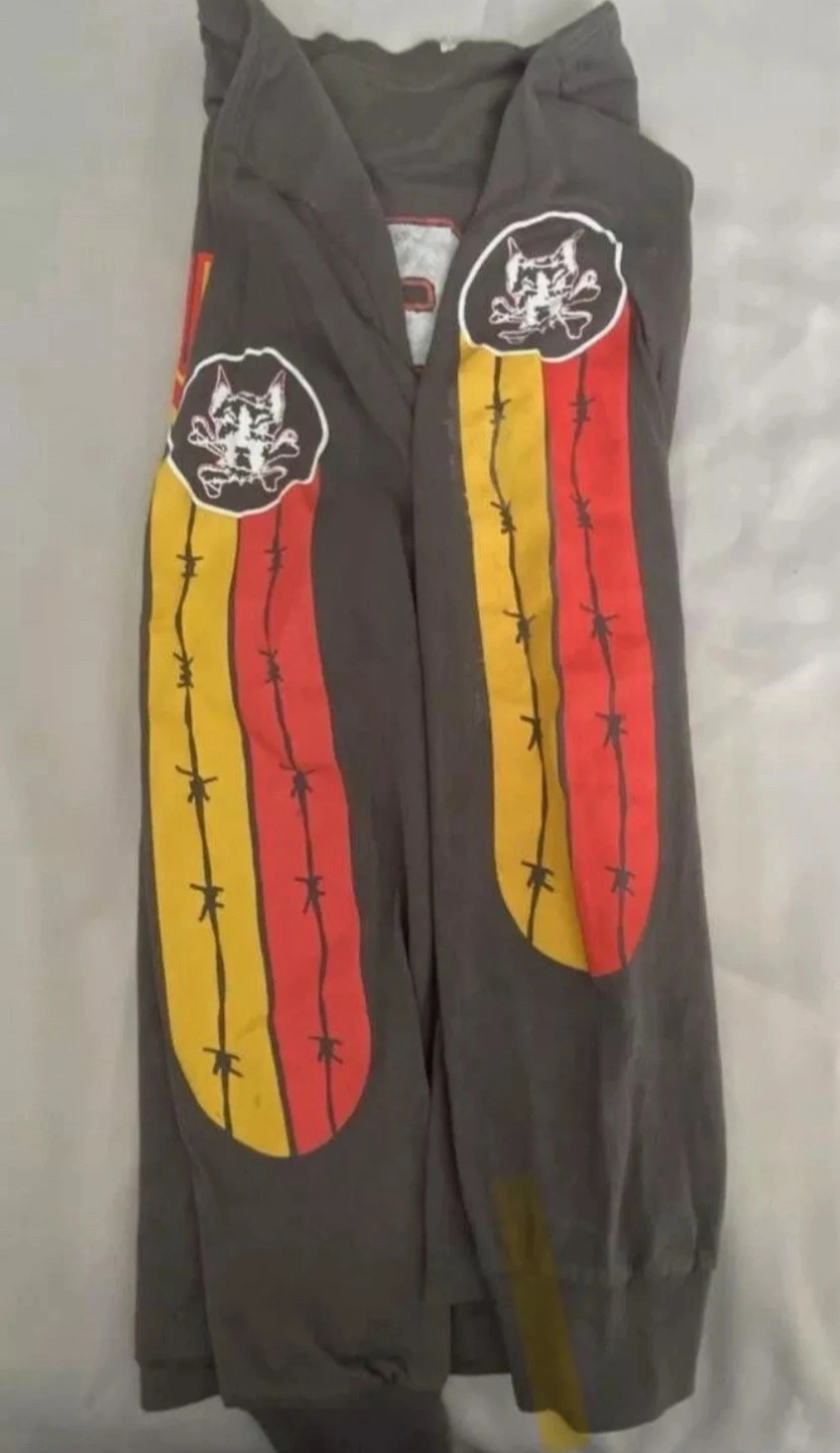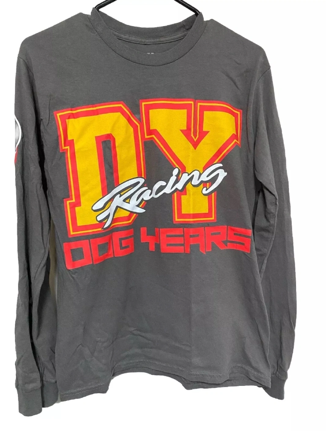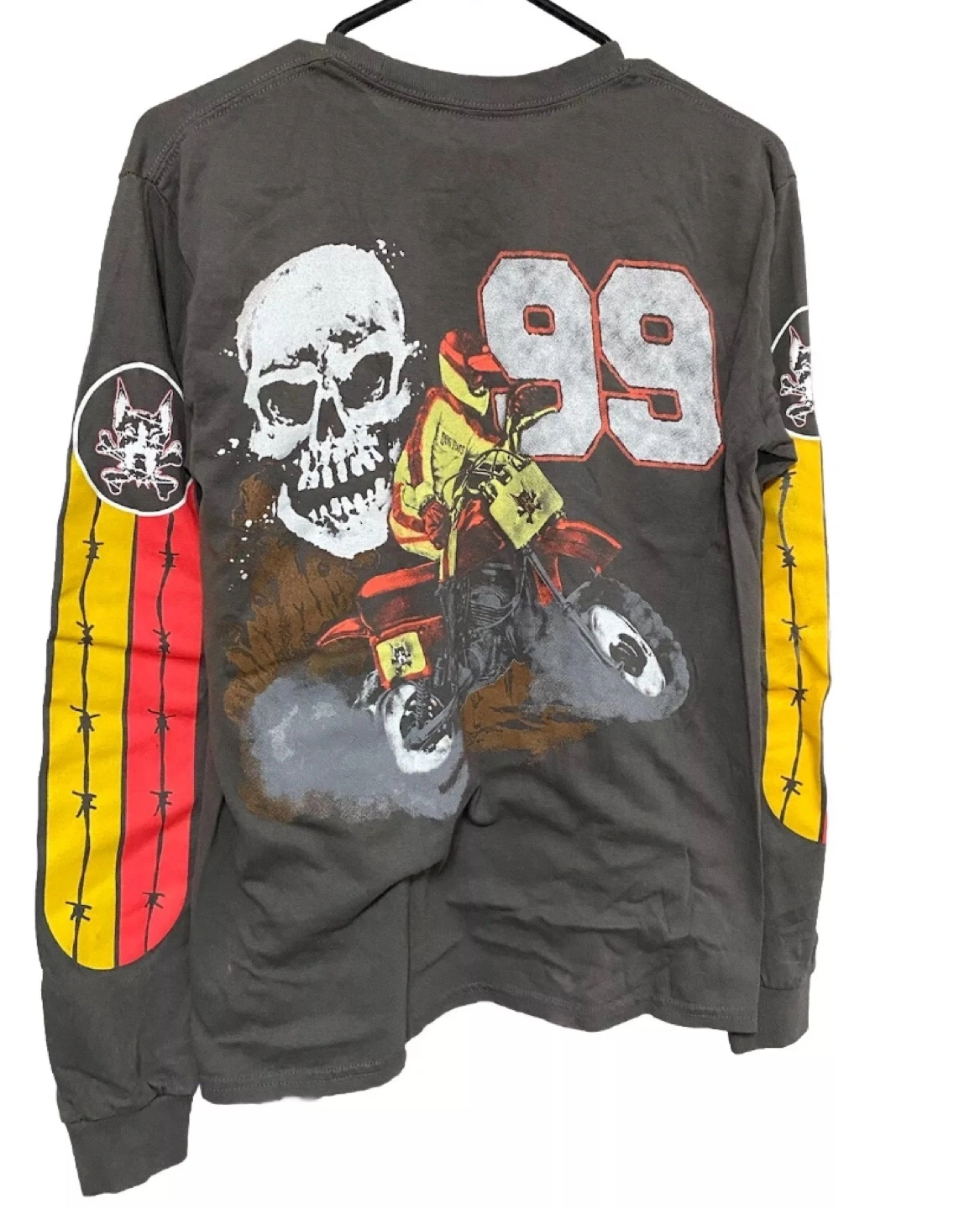 Long sleeve t-shirt with a graphic on the front and back. Grey in colour.