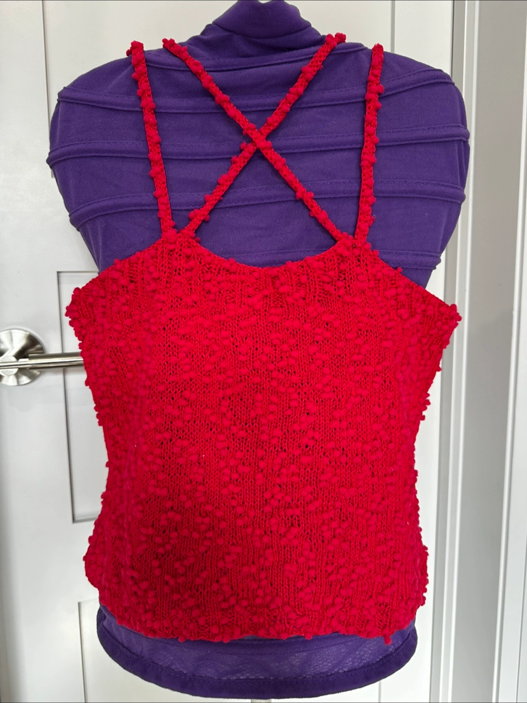 Red tank top. Features knit design with cross-back straps. 100 % cotton. Perfect for a relaxing summer day.