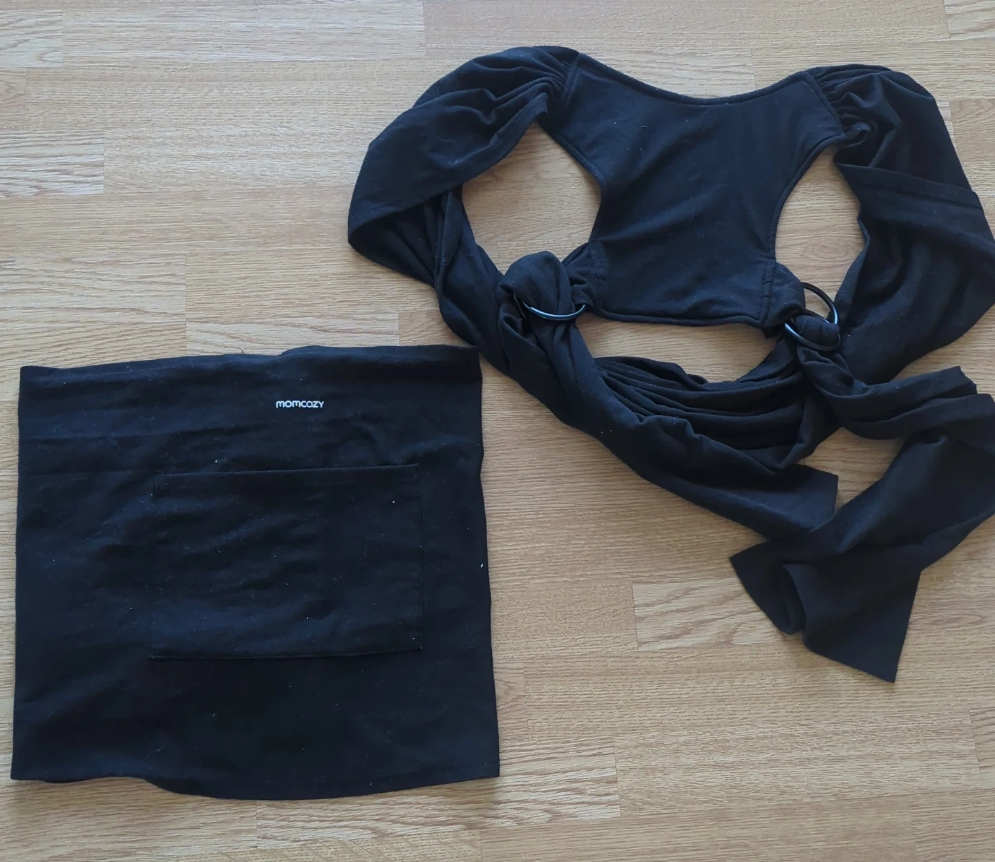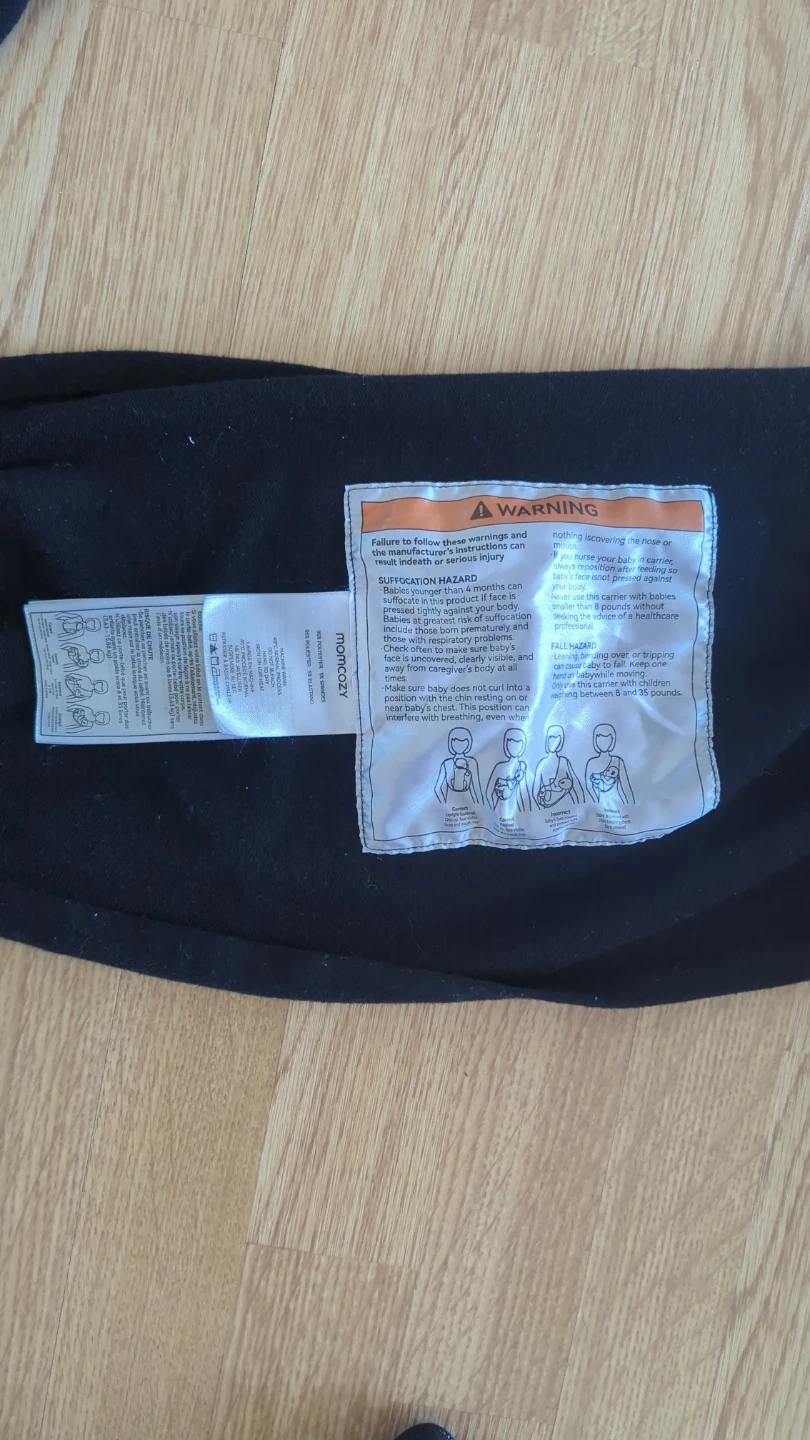 This is a black Momcozy baby wrap carrier made from a soft fabric. It includes a pouch for carrying essentials. It's suitable for newborns and infants up to 35 pounds.