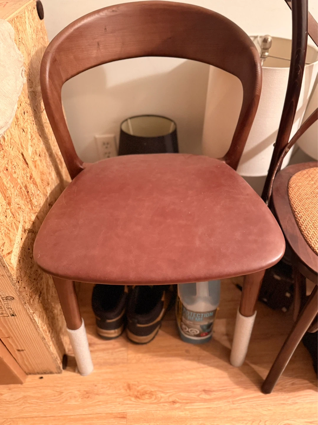 This dining chair features a curved wooden back and a comfortable upholstered seat in a reddish-brown hue. Its simple design makes it a versatile addition to any dining space. Chair legs are fitted with protective caps.
