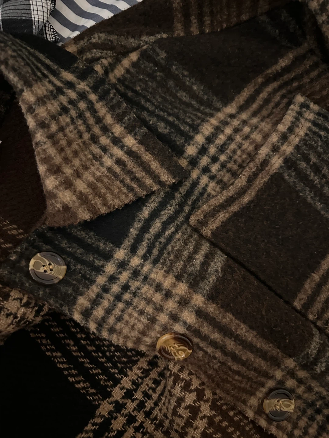 This is a Little Mountain Vancouver plaid shacket. It's a size medium and made from a warm, fuzzy material. Perfect for layering on cooler days!