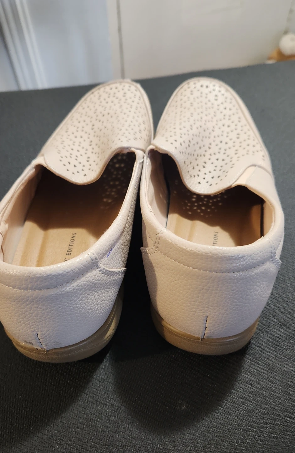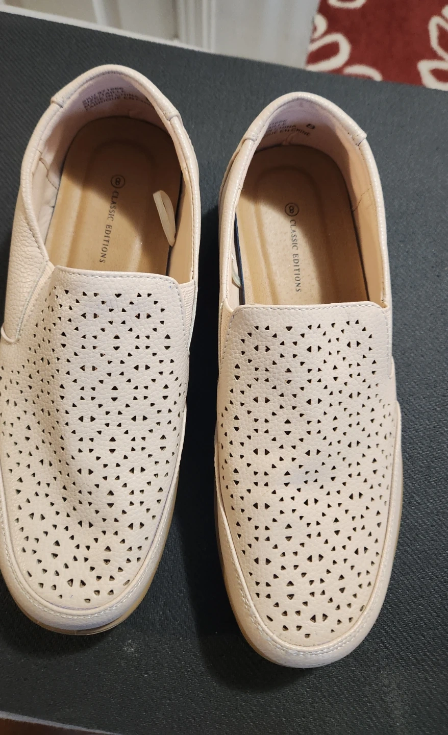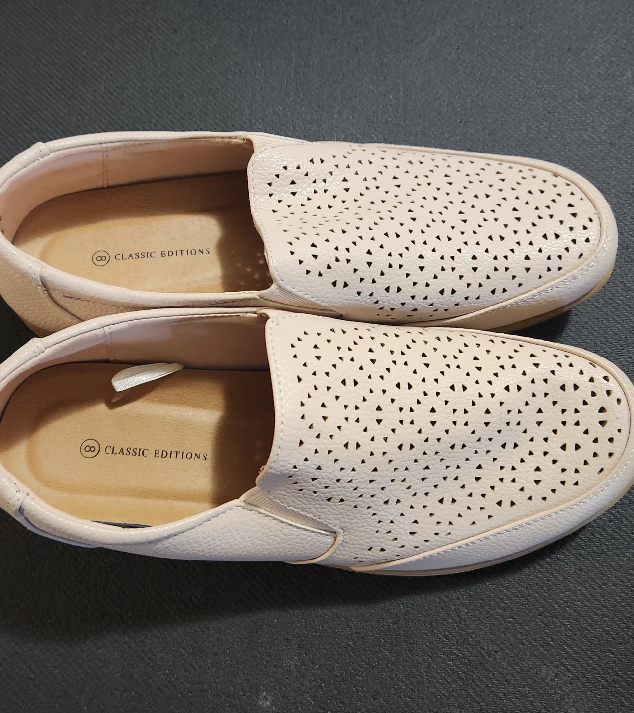 These women's slip-on loafers from Classic Editions feature a light pink colour and a perforated design. They are a size 8 with a comfortable fit. Slip-on style makes them easy to wear!