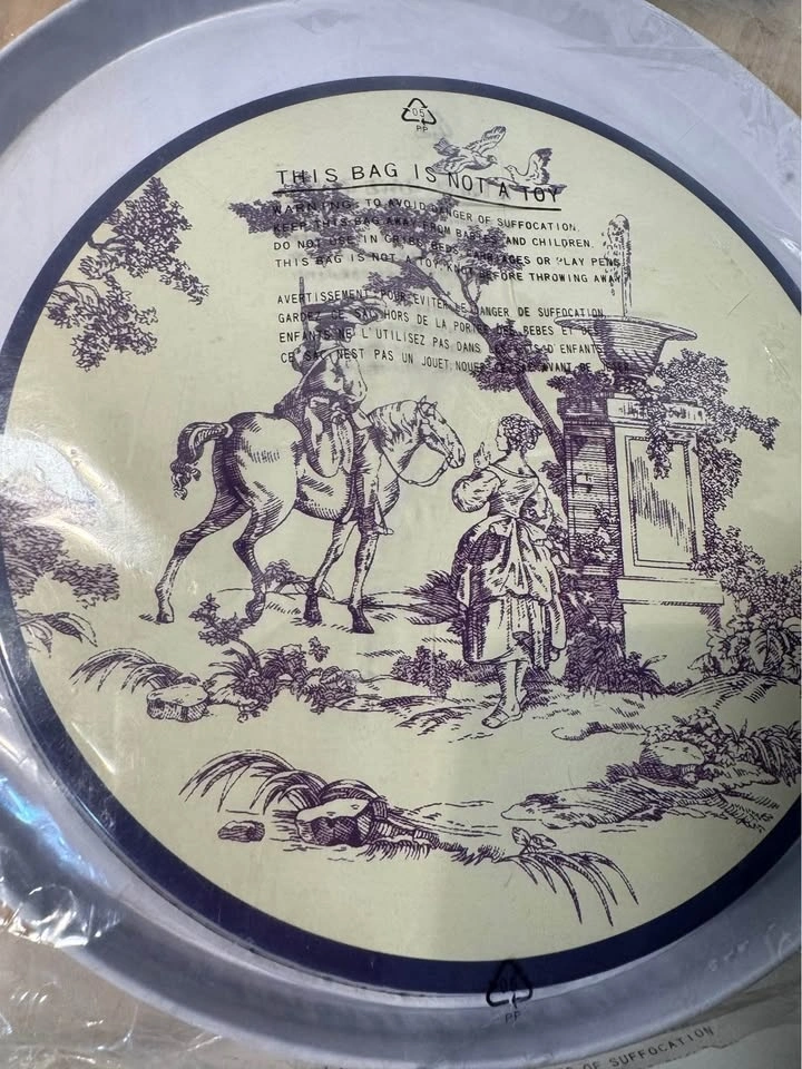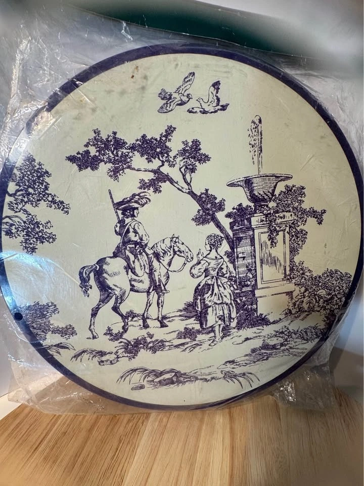 Set of four vintage decorative burner covers by Tabletops Unlimited, featuring the New England Toile (People) pattern. Includes two 10-inch and two 8-inch covers. They are blue and white and can also be used as a trivet or spoon rest. These are new, in their original packaging.
