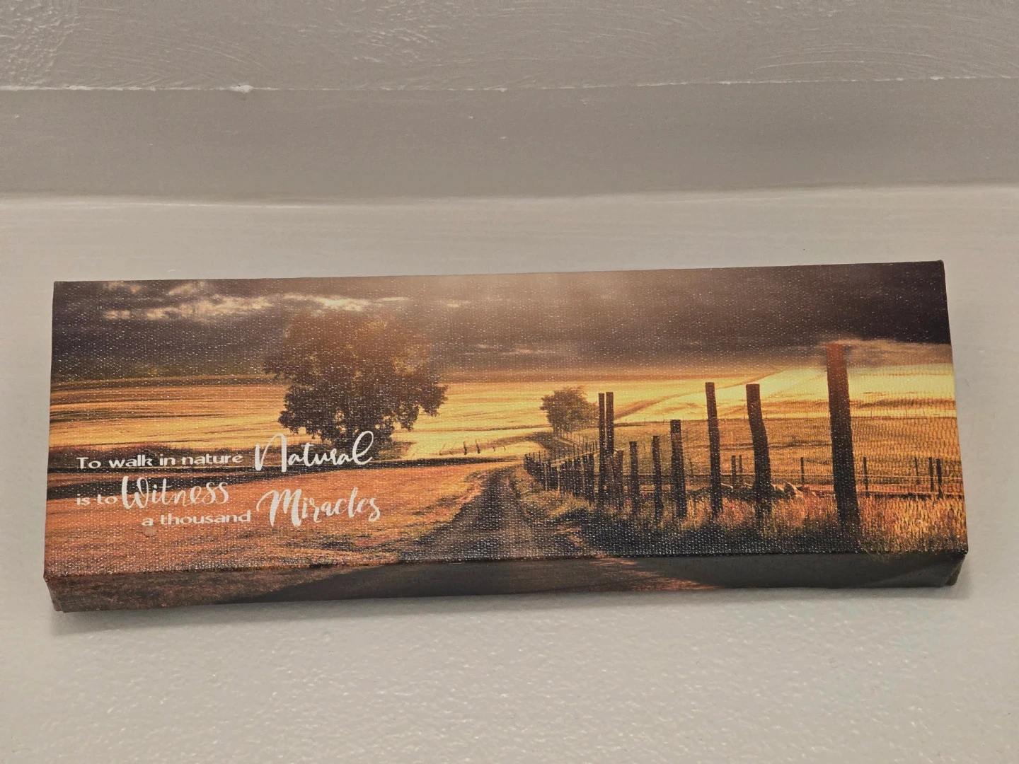Canvas wall art featuring a landscape scene with the quote "To walk in nature is to Witness a thousand Natural Miracles". It's approximately 10.5 inches wide and 5 inches tall. This piece is printed on canvas.