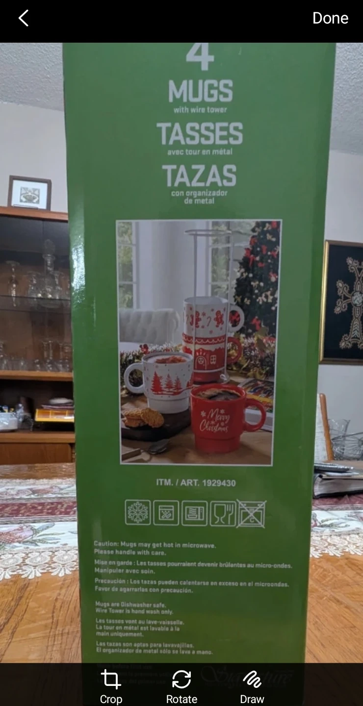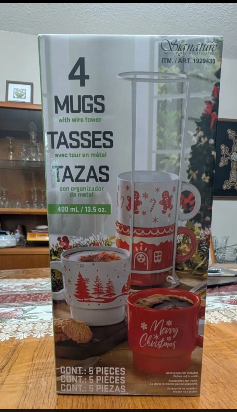 Unopened set includes four stoneware mugs with a wire tower for storage. Each mug has a festive Christmas design, and holds 400 ml (13.5 oz). The wire tower is made of metal.